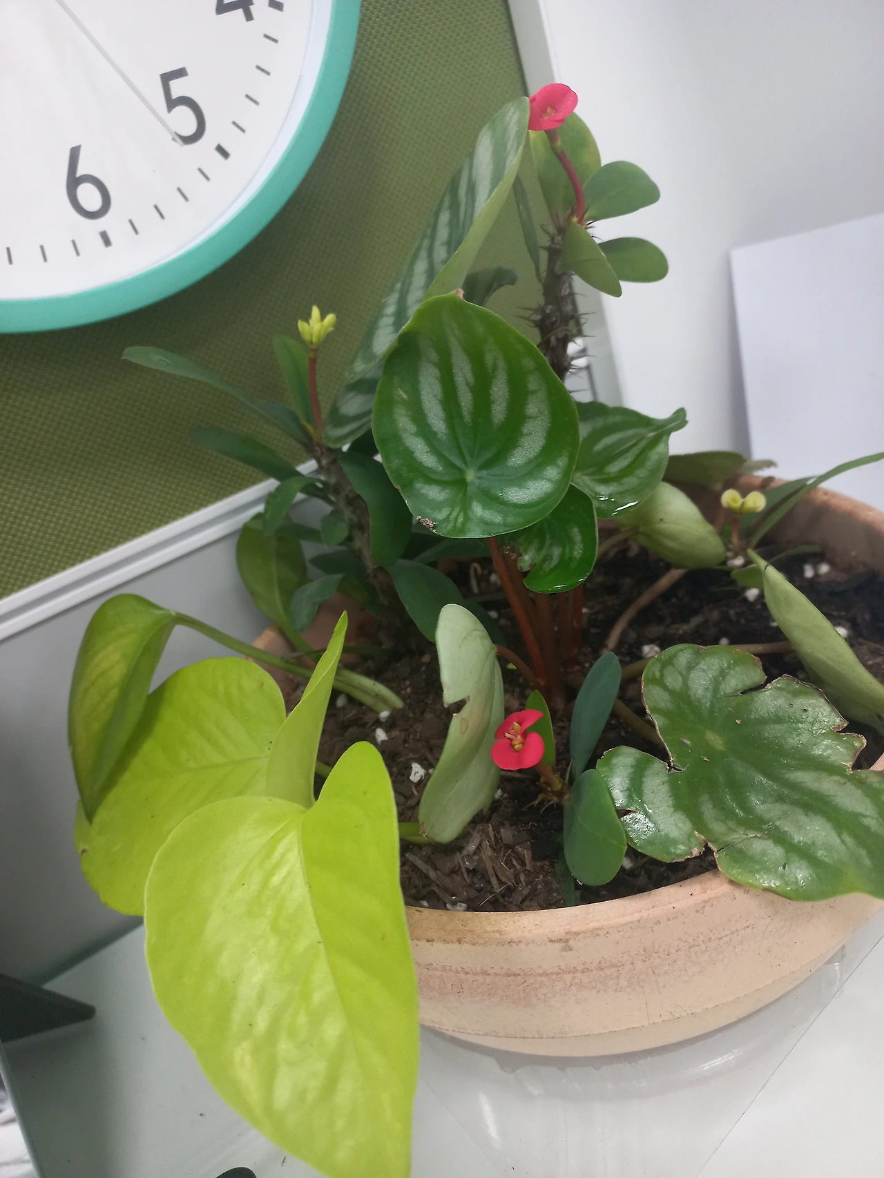 메인 수박페페 화기가 너무 넓어 그 빈 공간을 기린선인장 화이트와 레드 두 쌍, 형광스킨답시스 두 가지를 삽목 했다.