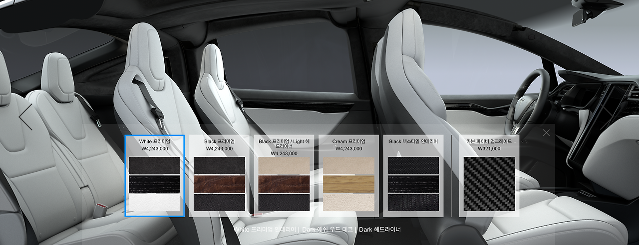 그다음은 인테리어. 인테리어는 기본은 블랙 직물시트이고 나머지가 추가 비용이 들어가는 블랙 가죽/크림 가죽/화이트 가죽으로 구성되어 있다. 이건 말로 설명하기 힘드니 이미지로 확인을 하면 될 것 같고 특징을 좀 설명하면 블랙은 그냥 온통 깜장. 깜장. 깜장. 부분을 카본으로 변경이 가능하다. 깜장 깜장 깜장. 그리고 화이트는 시트가 정말 하얀 하얀 하얀색이다. 물론 카본 추가가 가능하다. 이런 하~~~~ 얀 시트를 어떻게 쓰지?라는 생각을 하고 이것저것 찾아봤는데 우선 인조가죽이라서 관리가 쉽다는 의견이 많았고 실제 1년 동안 운행한 오너들의 해외 유튜브를 보면 물티슈로 슥슥 닦으면 얼룩이 사라지는 것을 확인했다. 물론 블랙보다는 관리가 어렵겠지만 한 번쯤은 아주 하~~~ 얀 시트를 의 차를 몰아 보고 싶어서 난 화이트 시트를 선택했다. 그리고 크림 시트는 위 천장까지 전 부타 크림이다. 그리고 실제 나무를 사용한 데코가 들어가 있어서 이전에 볼보의 인테리어 같은 친환경적인 느낌이다. 크림과 화이트를 고민하다가 결국 화이트를 선택한 것은 크림은 바닥까지 크림이기 때문이다. 발자국을 감당할 자신이 없었다... 메트를 깔면 된다고 했지만.. 내 마음은 이미 화이트... :-)