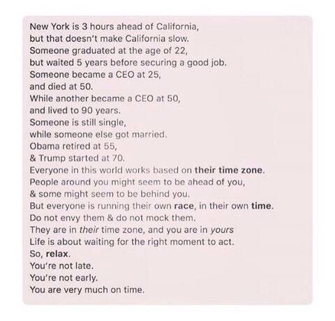 뉴욕은 캘리포니아보다 3시간 빠릅니다. 하지만 그렇다고 캘리포니아가 뒤처진 것은 아닙니다. 어떤 사람은 22세에 졸업을 했습니다. 하지만 좋은 일자리를 얻기 위해 5년을 기다렸습니다. 어떤 사람은 25세에 CEO가 됐습니다. 그리고 50세에 사망했습니다. 반면 또 어떤 사람은 50세에 CEO가 됐습니다. 그리고 90세까지 살았습니다. 어떤 사람은 아직도 미혼입니다. 반면 다른 어떤 사람은 결혼을 했습니다. 오바마는 55세에 은퇴했습니다. 그리고 트럼프는 70세에 시작했습니다. 세상의 모든 사람들은 자기 자신의 시간대에서 일합니다