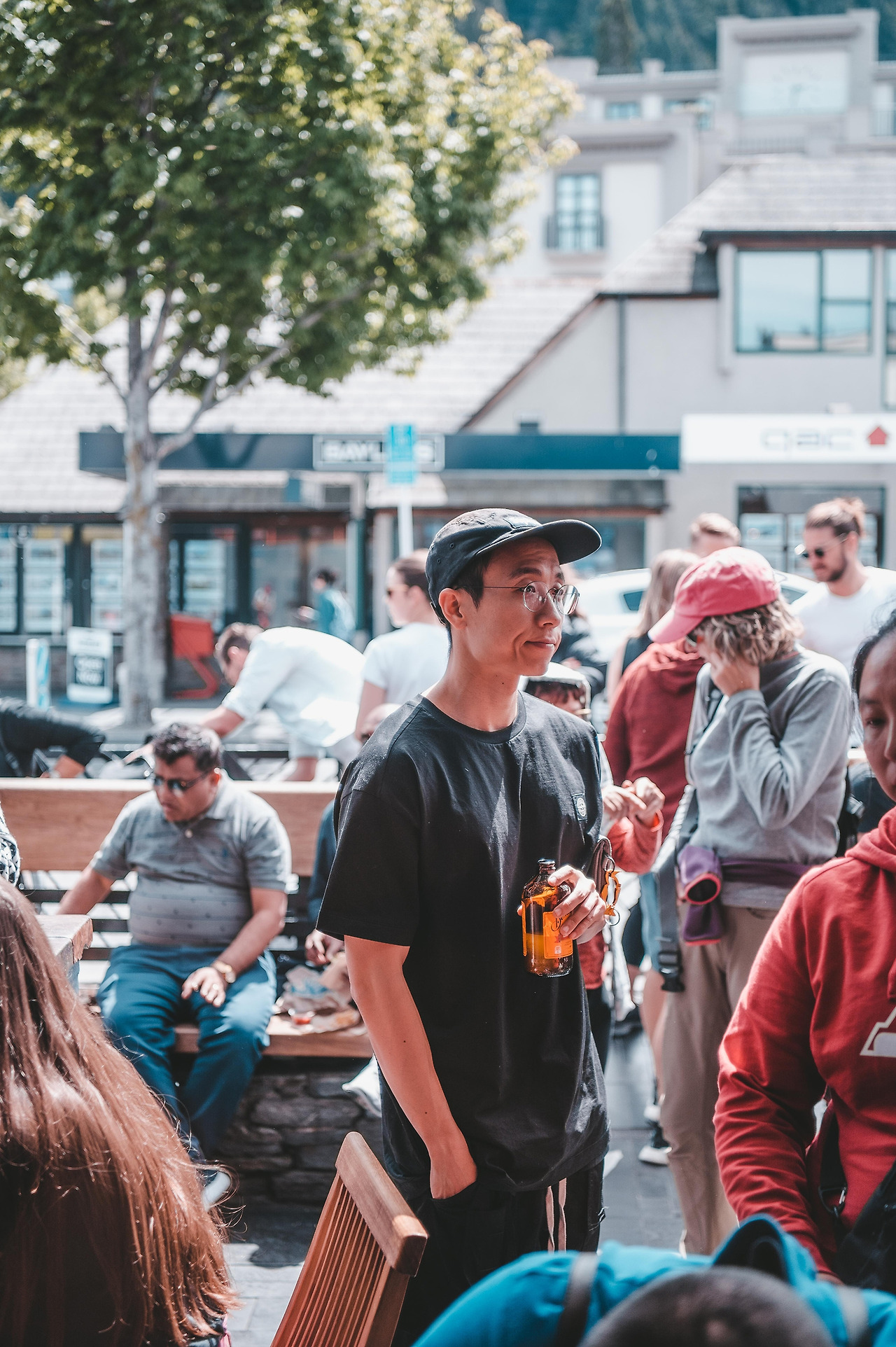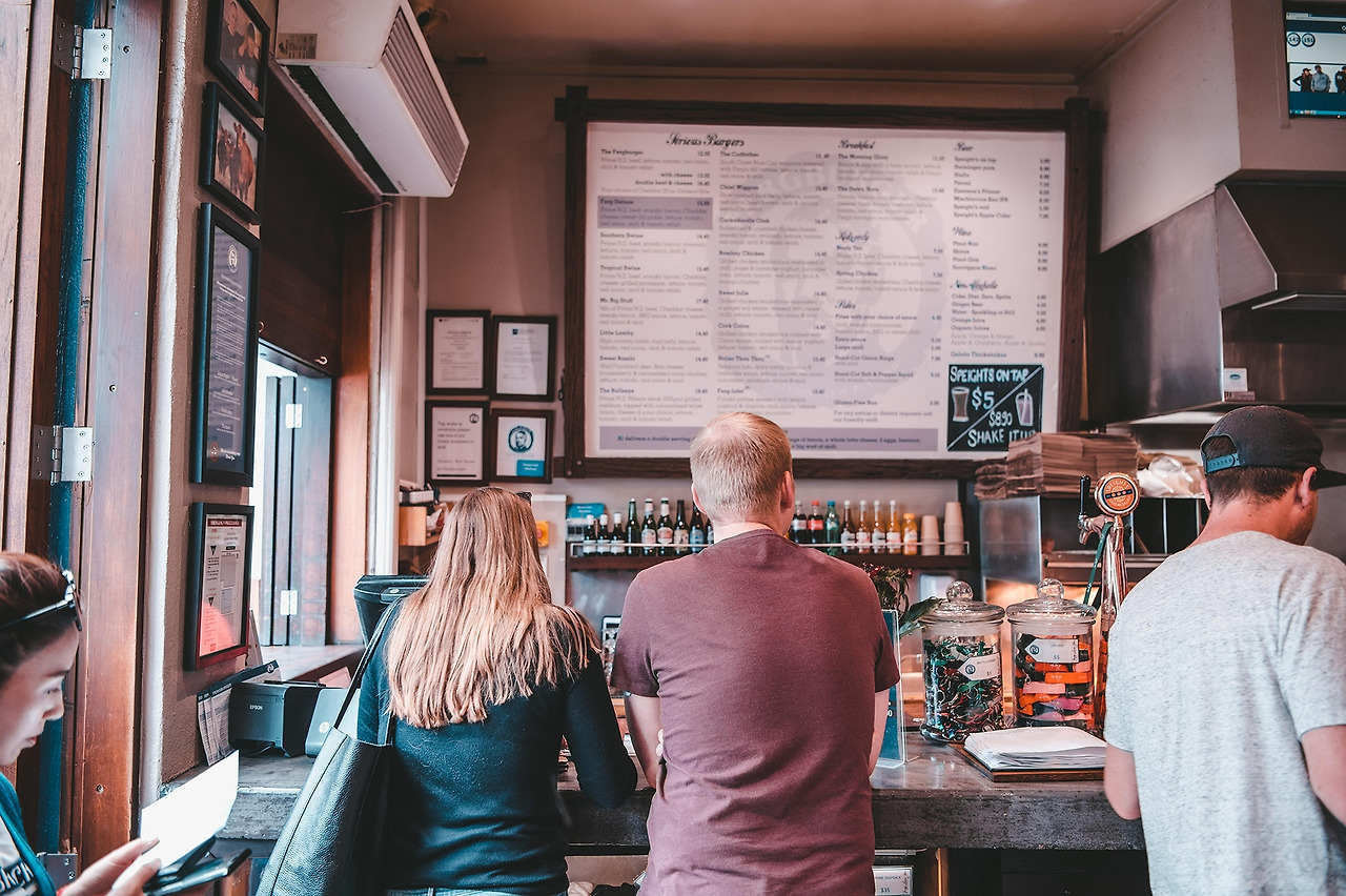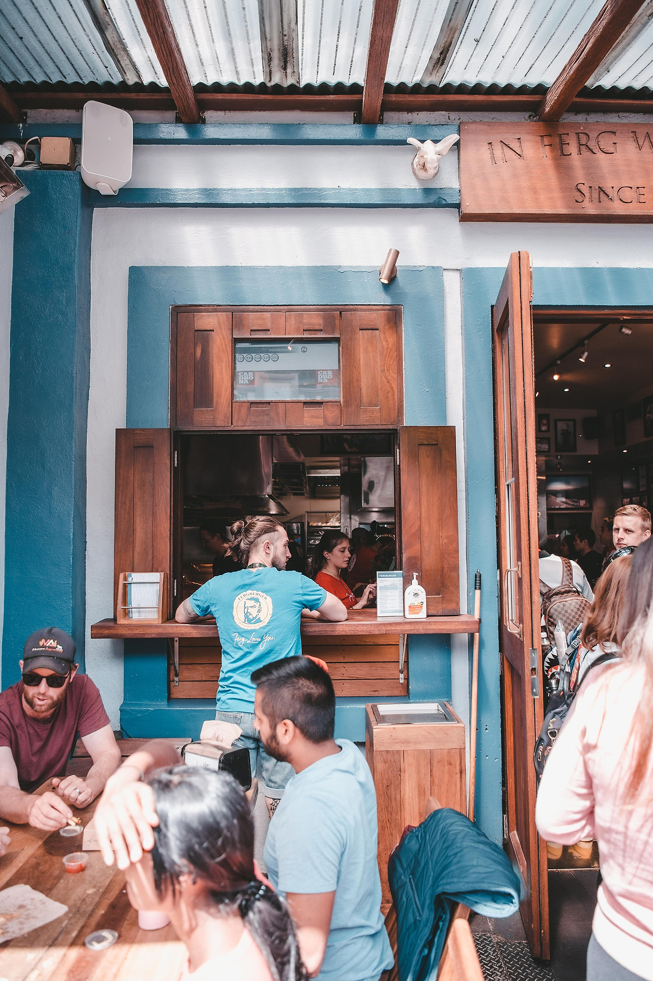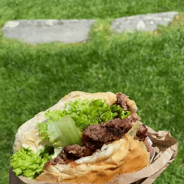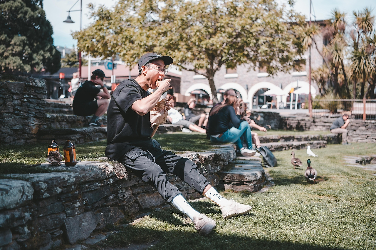그리고 한두 시간 기다렸다가 우리는 퀸즈타운(Queenstown)으로 출발했다. 사실 난 퀸즈타운이 어디 붙어있는지도 몰랐다. 가야 한다면 갔고 오라 하면 왔다. 그런데 나중에 알고 보니 퀸즈타운은 뉴질랜드의 가장 남쪽에 위치했다는 것을 아주아주 늦게 알았다. 그리고 퀸즈타운을 가는 풍경도 굉장히 좋았고 특히 공항이 너무 아담하고 아름다웠다. 공항이 왜 이래? 이게 공항이야? 공항이 이렇게 이뻐도 대? 실화냐? 우와. 날씨 미쳤네 ㅋㅋ 이런 말을 계속 반복했다. 공항에서 동구님이 렌터카 ( 참고로 뉴질랜드는 우핸들 )를 빌렸고 현지 유심도 사서 장착했다. 나는 여행을 가면 현지 유심을 사서 아예 한국 전화를 안 받는데 휴가 때 일하는 걸 원천 차단하기 때문이다. 그리고 한국에 돌아와서 욕을 엄청 먹지만... 왜 연락이 안 되냐고... ㅋㅋ 이제 로드트립의 시작이다. 우선 너무 배가 고팠기 때문에 숙소로 가는 길 다운타운에서 점심을 먹기로 했다. 아무 계획이 없었기 때문에 검색해서 가장 유명한 햄버거집으로 갔다. 그곳의 이름은 퍼그 버거 (FREG BURGER). 근처에 주차를 하고 가게 앞을 갔는데 사람이 엄청나게 많았다. 동네 사람들 관광객은 이곳에 다 모인 것처럼. 우리도 관광객이니 즐겨주겠다며 줄을 서고 햄버거를 샀다. 생각보다 주문도 빠르고 음식도 빠르게 나와서 20분 정도 기다렸던 것 같다. 매장 안은 사람이 많아사 근처에 그냥 길바닥에 앉아서 먹자고 했다. 사실 아무 데나 앉아서 먹어도 될 만큼 날도 좋았고 풍경도 좋았다.