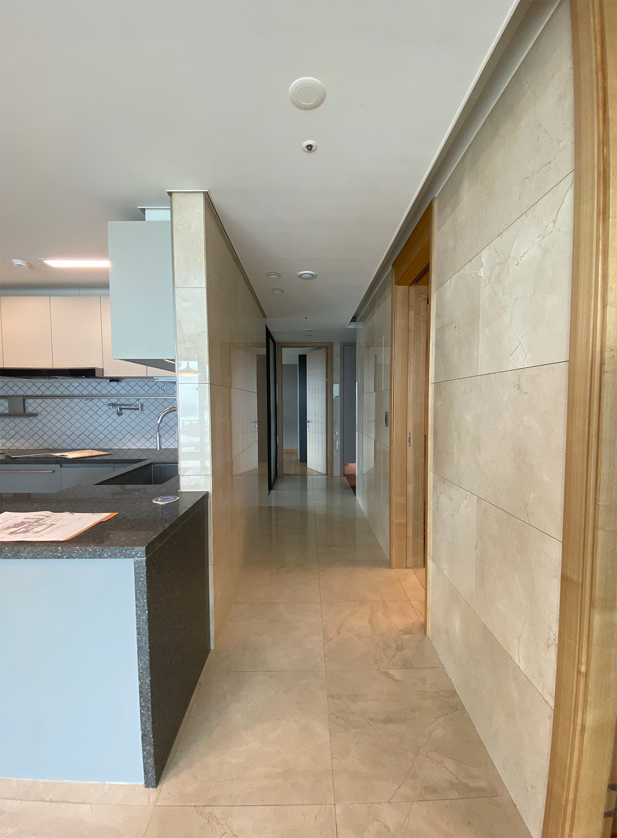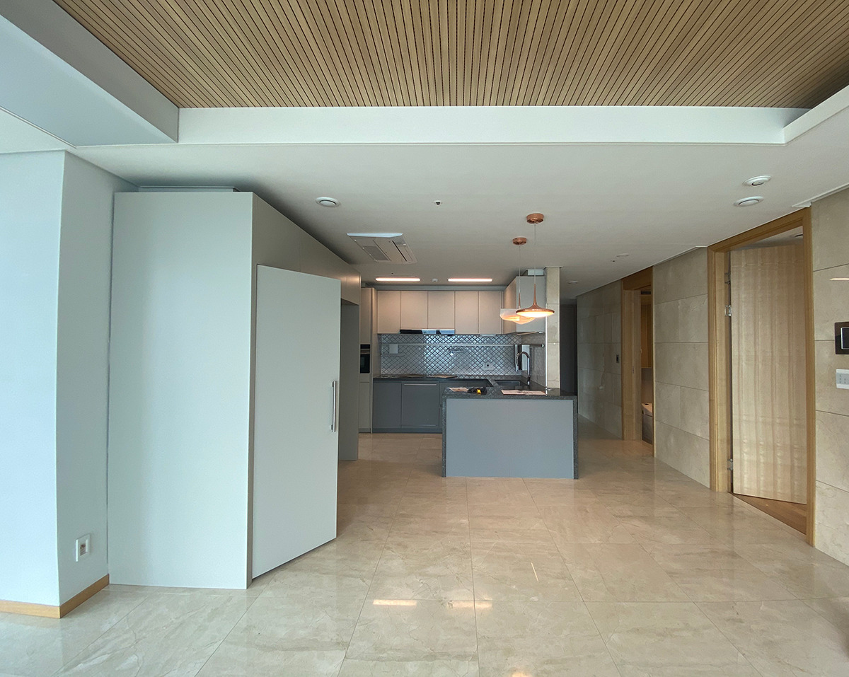 이 집의 메인은 거실 및 주방이다. 아마 모든 집의 메인은 거실과 주방일 것이다. 이 집도 마찬가지로 거실과 주방 그리고 드레스룸 및 서재가 연결되는 구조가 가장 큰 콘셉트이다. 이 집은 남서향 집이고, 뷰가 좋은 집이라 어디서든 뷰를 볼 수 있는 구조로 설계하였다. 집에 끝쪽인 서재에 앉아 있어도 뷰를 볼 수 있도록 구성되어 있다는 말이다. 책상에 앉아서 멀리 있는 창을 볼 수 있도록 천장에는 뭔가 메달려 있는게 싫었다. 그래서 후드가 필요 없는 후드 일체형 인덕션의 선택이 포인트라고 할 수 있겠다. 물론 아직 성능은 알 수 없다. 집에서 요리를 아직까지 해본 적이 없기 때문이다. 소재의 통일감을 위해 아일랜드 상판은 스테인레스 마감으로 진행을 했다. 관리가 힘든 부분이 있다고는 했지만 디자인 통일감을 포기할 수 없었기 때문에 에라 모르겠다고 결정을 했고 현재 보기에는 좋아 보인다. 아마도 살면서 장단점이 나올 것 같다. 아일랜드 주방을 설계할 때 다이닝 테이블 높이를 아일랜드 주방가구 높이와 맞추려고 했다. 이유는 단순하게 디자인상 이뻐 보일 것 같아서였다. 만약 생각한 높이대로 제작을 했다면 바 타입 의자에서 식사를 해야 하는 상황이었을 것이다. 고민 끝에 일반 테이블 높이로 결정하고 제작을 하지 않고 기성품을 구매하였다. 이유는 가끔 어머니가 오실 것 같은데 식사하실 때 불편할 것 같아서였다. 결정하고 생활해보니 시각적인 측면에서는 실이 있었지만 사용하는 입장에서는 좋은 선택이였다.