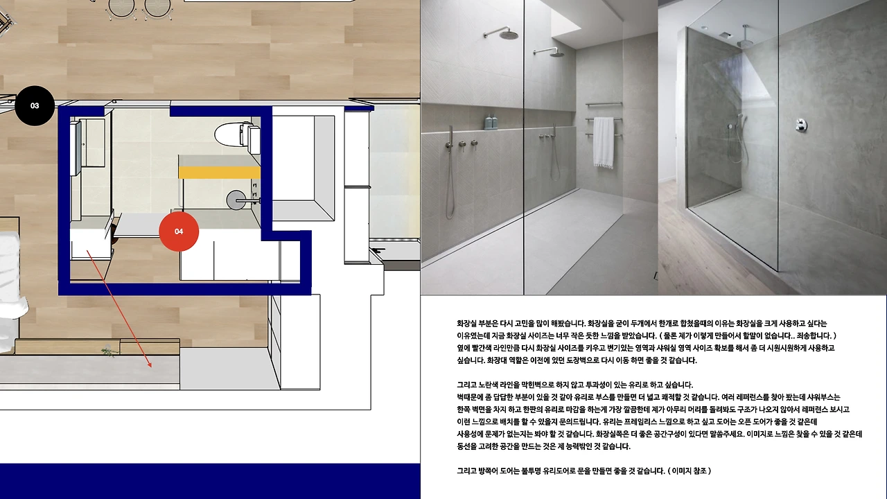 30평대 아파트는 대부분 2개의 화장실을 보유(?)하고 있다. 거실에 있는 게스트용과 침실에 있는 개인용이라고 할 수 있겠다. 이렇게 2개의 화장실은 나름 사용에 장점이 있지만 작다라는 느낌은 어쩔 수가 없기 마련이다. 그래서 난 화장실을 1개로 크게 크게 사용하기를 원했다. 그리고 집에서 욕조 사용 빈도수가 아주 적기 때문에 널찍한 세면대와 샤워부스만을 원했다. 큰 타일과 유리. 그리고 조명이 끝인 아주 깔끔한 화장실인 것이다. 수납은 상단 수납과 하단 수납으로 넉넉하게 구성하였고 기교 없이 단순한 구조로 구성을 하였다. 한 가지 아쉬운 점이라면 바닥의 단차이다. 방과 거실과 화장실의 바닥 높이를 같도록 구성하고 싶었는데 이 부분을 까먹고 있었다는... 물론 나는 화장실을 건식으로 사용한다. 건식의 장점은 관리가 너무 편하다는 점! 미쿡 서타일.