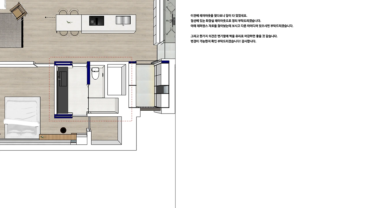 기존 도면을 보면 알겠지만 거실 1 방 3 화장실 2개의 평범한 구조의 아파트이다. 개인적으로 한국의 아파트 및 빌라는 작은방을 여러 개 만드는 게 항상 불만이었다. 그래서 나는 제거할 수 있는 벽은 모두 제거해달라고 말씀드렸고, 그 과정에서 그래도 방은 하나 있어야 한다고 말씀해주셔서 잠을 잘 수 있는 방은 분리하게 되었다. 그리고 나머지 공간은 전부 개방해서 사용할 수 있도록 구성하였다.