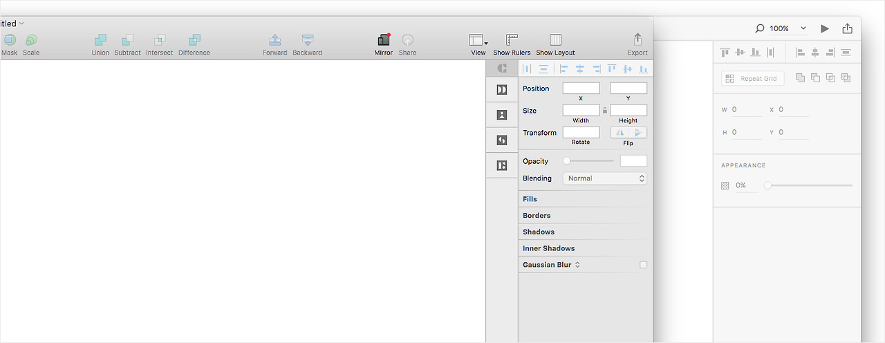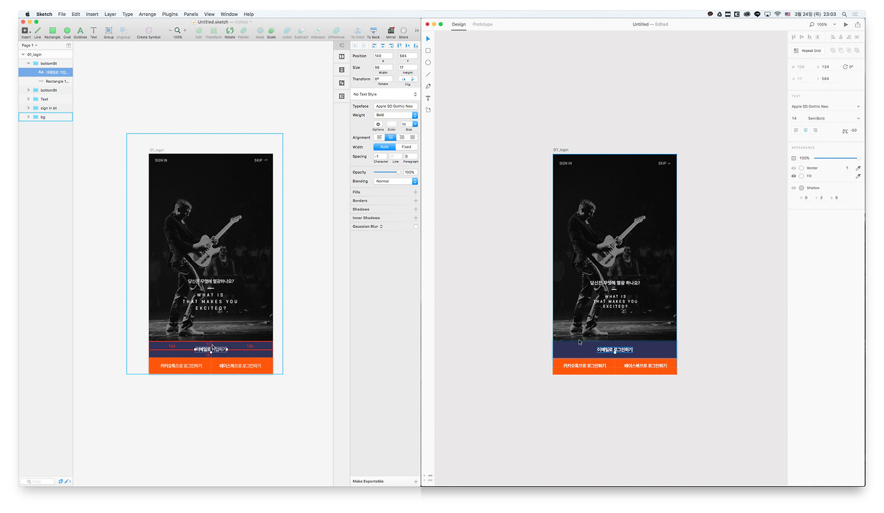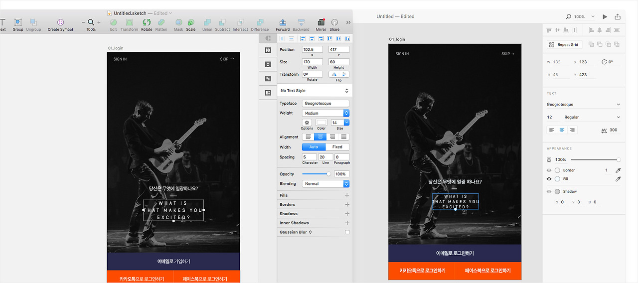 좌측 영역의 오브제나 타이포가 셀렉트 되었을 때의 크기나 위치, 색상 등을 수정할 수 있는 옵션이 있습니다. 아직까지는 Sketch가 Blur, Inner Shadows의 기능을 더 가지고 있고 XD는 기본적인 Border와 Shadows, Opacity기능만을 가지고 있습니다. 그리고 정렬을 하거나 수치를 입력하는 것은 동일합니다.
