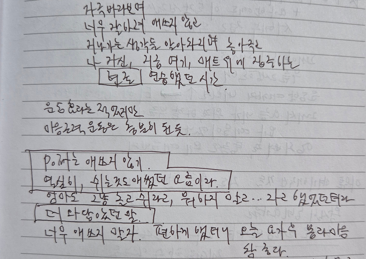 이날의 마음 근력 운동이 인상 깊었던 나는 요가 일지에 이렇게 썼다. “포인트는 애쓰지 않기. 열심히, 쉬는 것도 애썼던 요즘이다. 엄마도 뭐 하지 말라고 하셨던 터라 더 와닿았던 말. 너무 애쓰지 말자.” 그리고 다음날 나는 급성 번아웃으로 요가고 뭐고 뭘 하지를 못했다. 이 순간 나에게 딱 필요한 말이었어서 이날 “애쓰지 말라”는 메시지에 유달리 마음이 동했던 걸까. 애씀 제로의 하루를 보내고 맞은 목요일 아침에 나는 그 어느 날보다 개운하게 일어났다. 오전에 아쉬탕가 요가까지 했다. (목요일 아침이 망설여지는 단 하나의 이유는 바로 아쉬탕가다. 너무 빡세다….) 그리고 지금 이렇게 브런치 마감도 하고 있다. (힘이 얼마 남지 않았다. 후우우.)