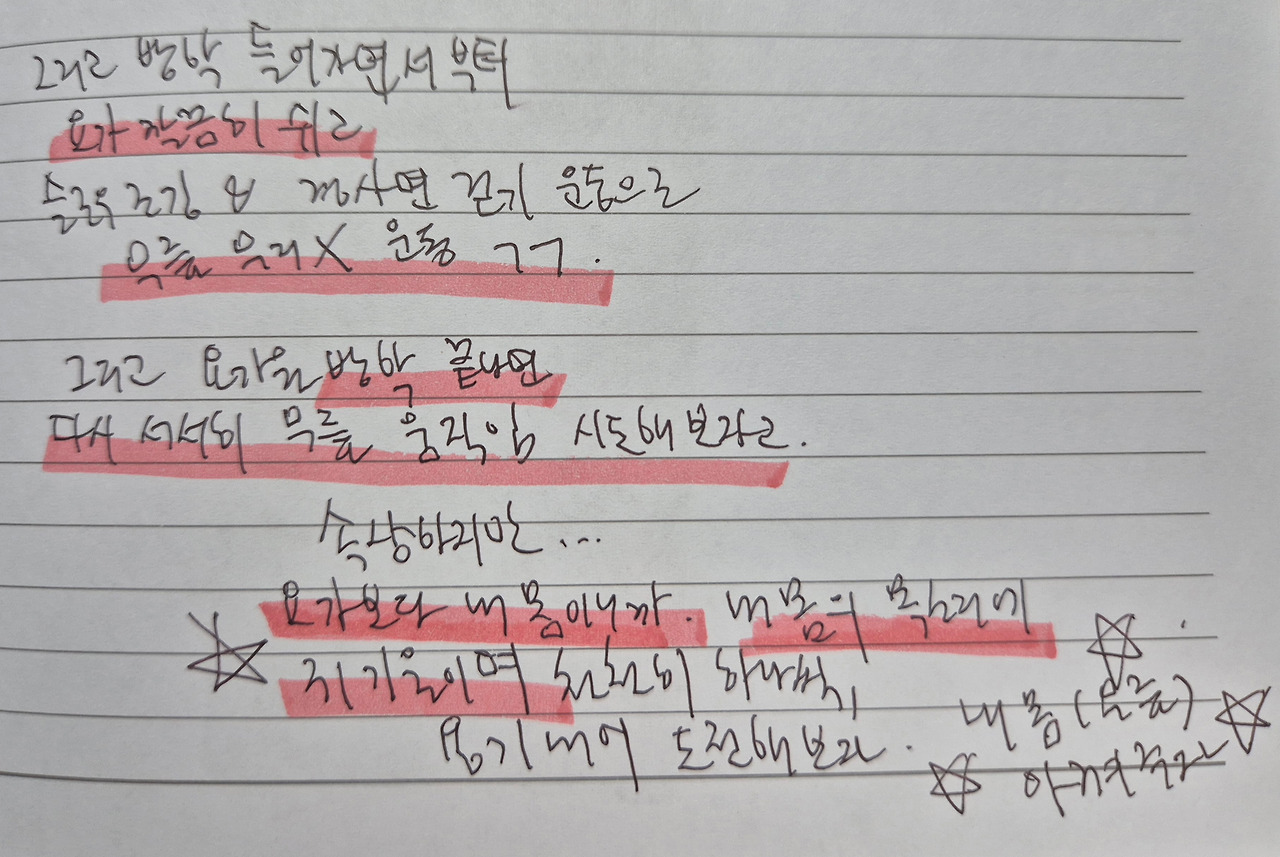 무릎의 완전한 회복을 기원하며 요가는 일절 하지 않을 것이다. 원래 같으면 집 작은 방에 노트북을 켜서 유튜브 속 에일린 언니를 만나 30분, 1시간씩 혼자서라도 요가를 했겠지만 이번에는 아니다. 그렇다고 운동을 아예 쉬진 않을 건데 (응?) 헬스장에서 평소 뛰는 속도보다 2배 느린 빠르기로 천천히 조깅하고 경사면을 빠르게 걷는 운동을 해볼까 한다. 무릎에 무리가 간다면 바로 운동을 멈춘다는 전제가 깔려 있다. 그리고 요가원 방학이 끝나면 다시 무릎의 움직임 강도를 서서히 높여보겠다고 다짐한다. 이런 다짐과 함께 요가하는 사샤는 요가 일지의 마무리를 이렇게 썼던 것이었다. “속상하지만… 요가보다 내 몸이니까. 내 몸의 목소리에 귀 기울이며 천천히 하나씩, 용기 내어 도전해 보자. 내 몸을 아껴주자.” 지금 요가 일지를 보면서 또 한 번 소름이 끼친다. 이렇게까지 비장할 일인가, 나 자신이여.
