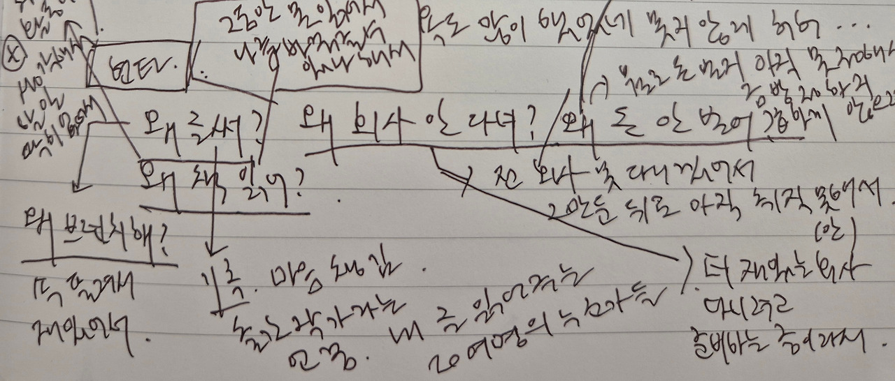 우선 이렇게 네 문장. 이 문장으로부터 화살표를 하나씩 빼내 그려가며 나 스스로 답을 해봤다. 공포 그 자체였던 카페에서 써 내려간 자문자답의 내용을 옮겨본다.