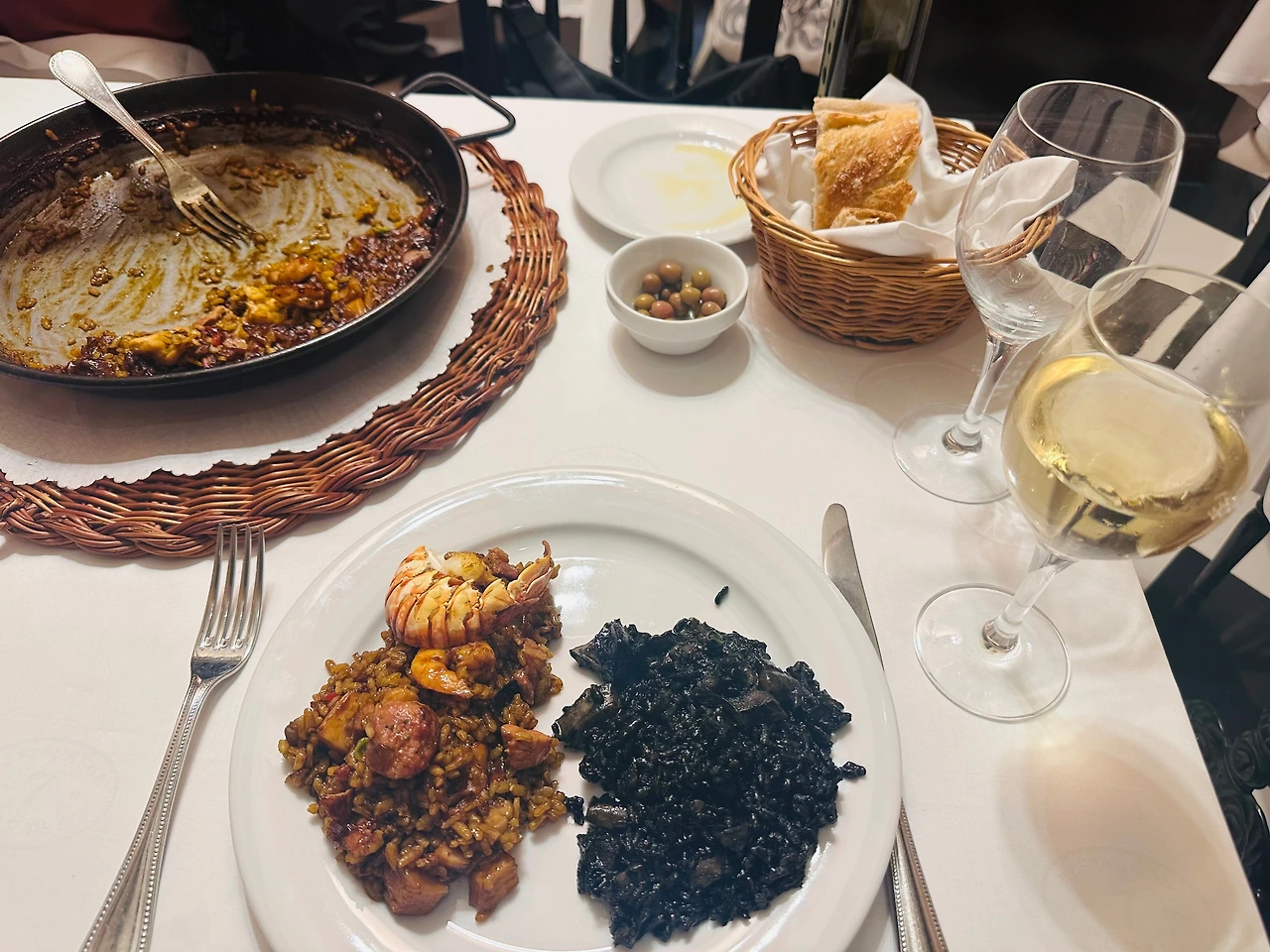 우리는 와인과 함께 해산물 빠에야, 먹물 빠에야를 주문했다. 서빙하는 직원분이 정성스럽게, 각각의 접시에 덜어주신다. 약간 짜기는 했지만 해산물도 많이 들어가 있고, 무엇보다 우리에게 친숙한 쌀이다 보니 맛있게 먹었다. 와인도 두 병이나 비웠다. 바르셀로나를 여행한다면 한 번쯤 방문해도 좋을만한 곳일듯싶다. 한 가지 불편한 점이 있다면 계산하기가 쉽지 않다는 것. 우리나라처럼 음식을 다 먹고 나가면서 계산하면 편할 텐데, 스페인에서는 직원과 눈이 마주칠 때까지 기다렸다가 계산서를 받고, 앉은자리에서 계산을 하기 때문이다. 너무 바쁜 직원분을 부르지도 못하고 우리 쪽을 봐달라는 텔레파시를 계속 보내야 했다.