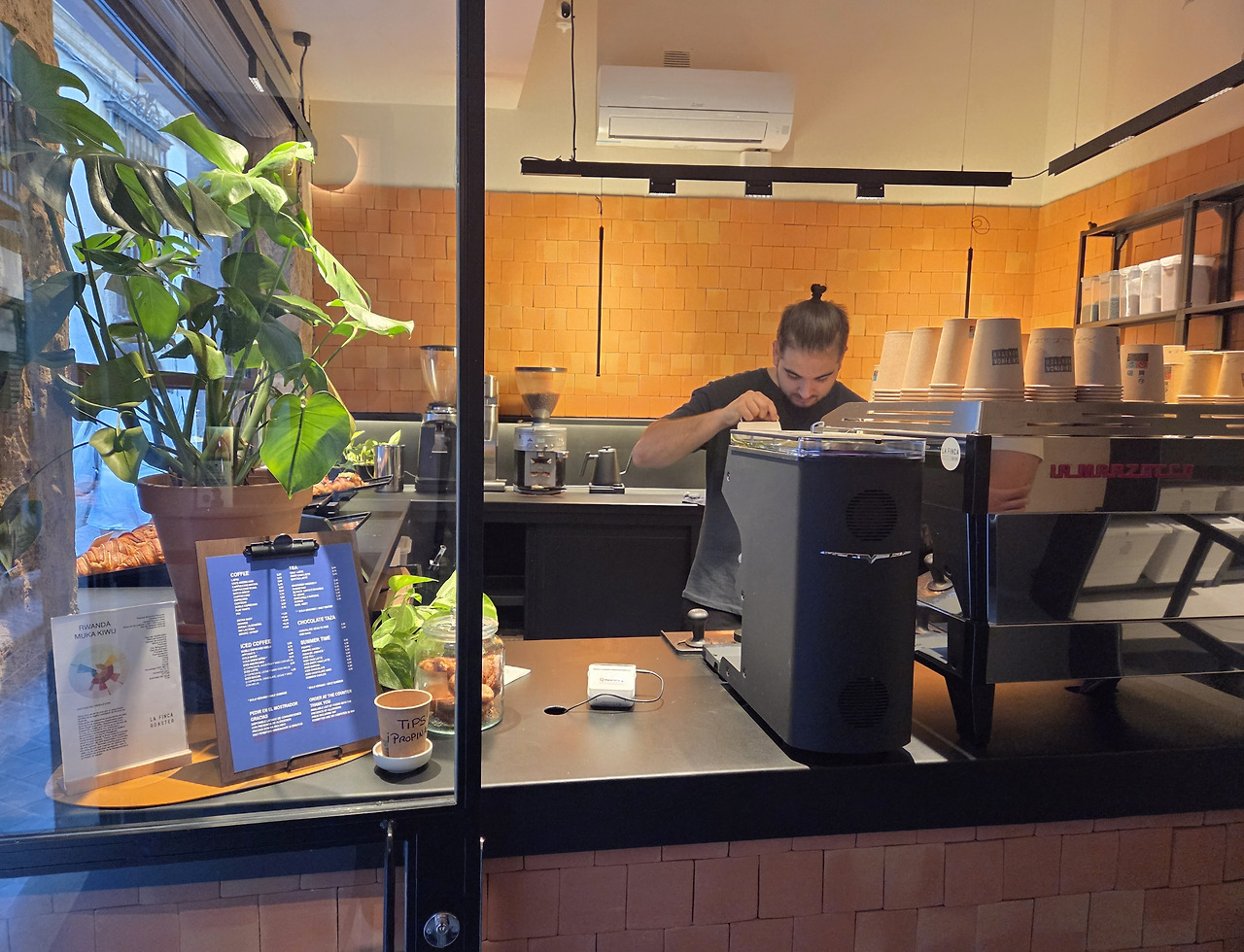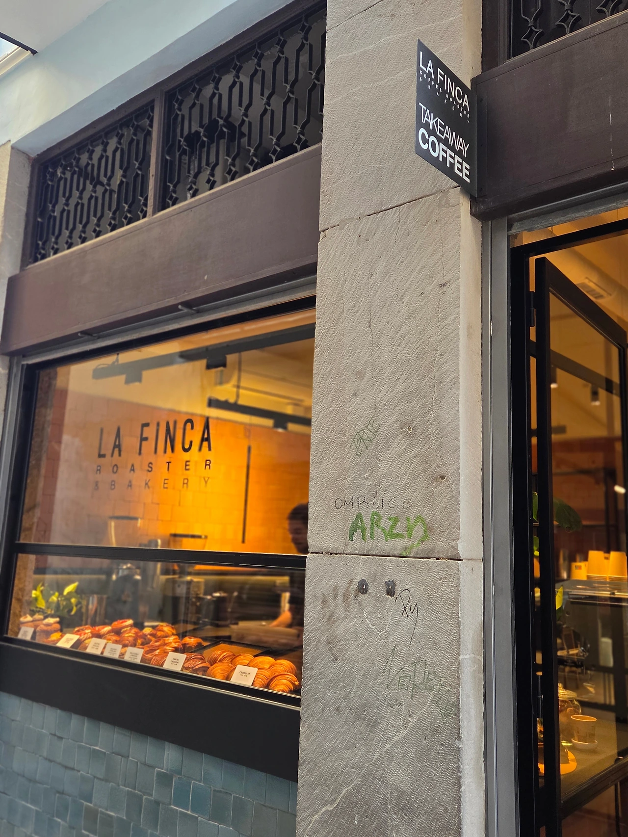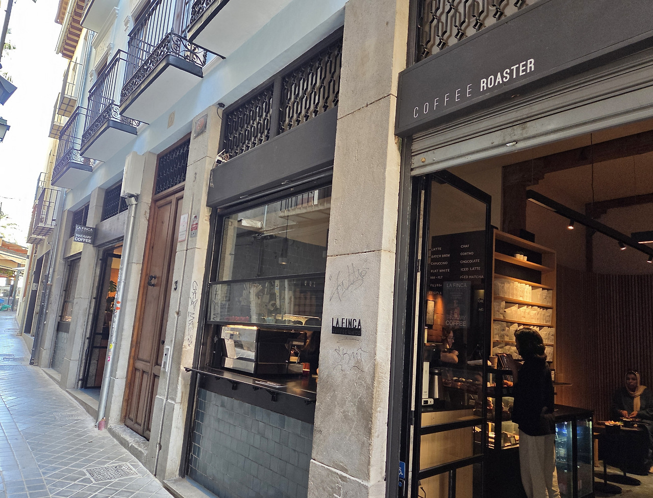 아직 커피를 먹지 못해 근처에 카페를 찾다가 대성당 근처에 ‘La Finca’라는 곳이 평이 좋아 찾아가 보았다. 맛집답게 사람이 많았다. 주문이 많아 바쁜데도 바리스타 분이 친절하게 응대해 주시고 라테를 주문하니 아트도 만들어 주신다. 우리 셋 다 커피에 조예가 깊은 것도 아니고, 에스프레소는 너무 써서 잘 못 먹는 촌스런 입맛이다 보니 스페인 여행 동안 라테를 주로 마셨다. 우리가 흔히 마시는 라테와 비슷한 것을 원한다면 ‘라테 콘 레체나’를, 그보다 조금 더 커피가 진하고 우유 양이 적은 것은 원한다면 ‘코르타도’를 주문하면 된다.