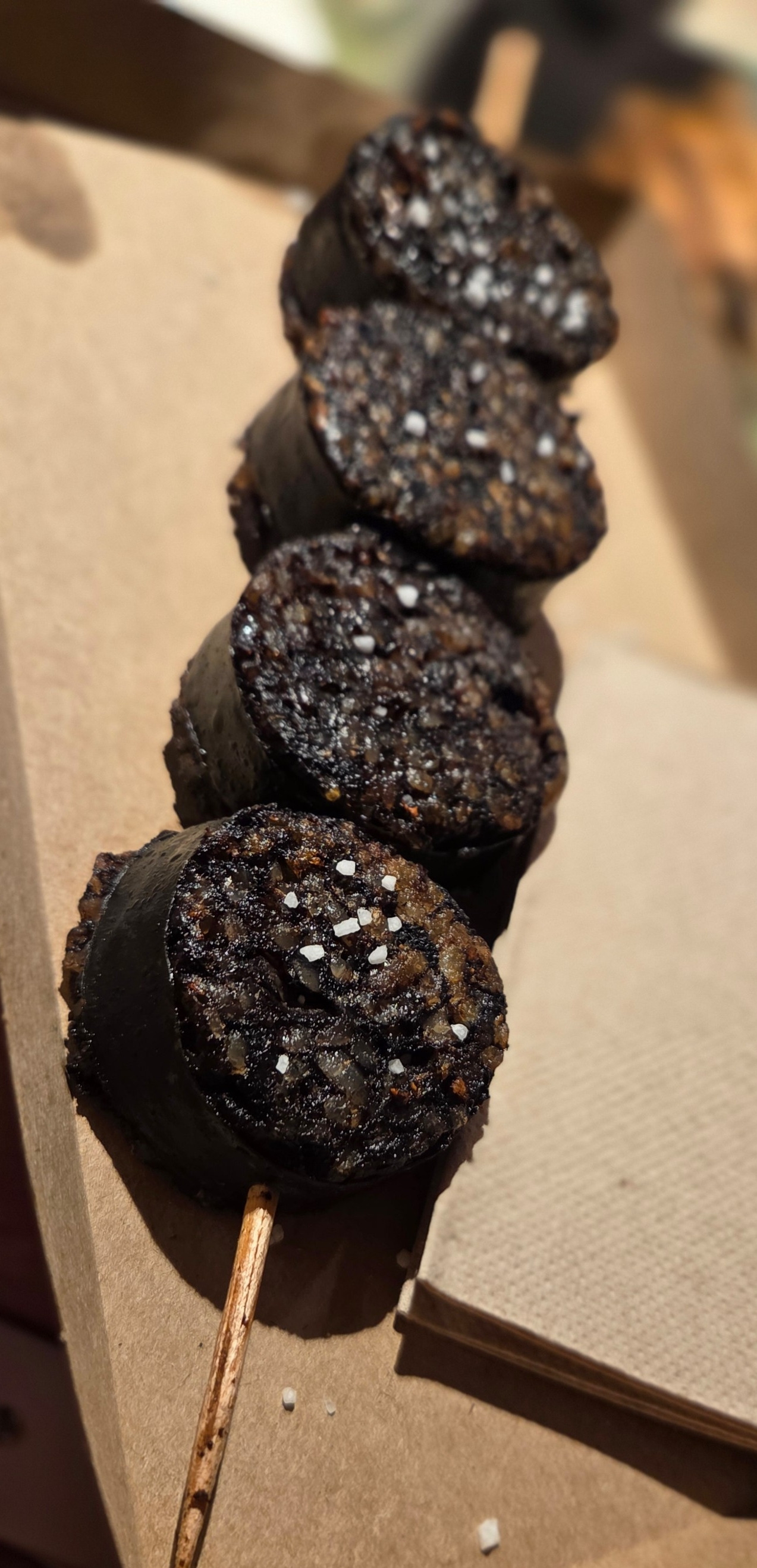 와인 가게에서 와인 한잔씩을 주문하고 들고 돌아다니며 먹고 싶은 음식들을 하나씩 사서 먹어보았다. 처음 도전한 것은 순대꽂이 비슷하게 생긴 것이었는데 생각했던 것보다 퍽퍽해서 그냥 so-so.