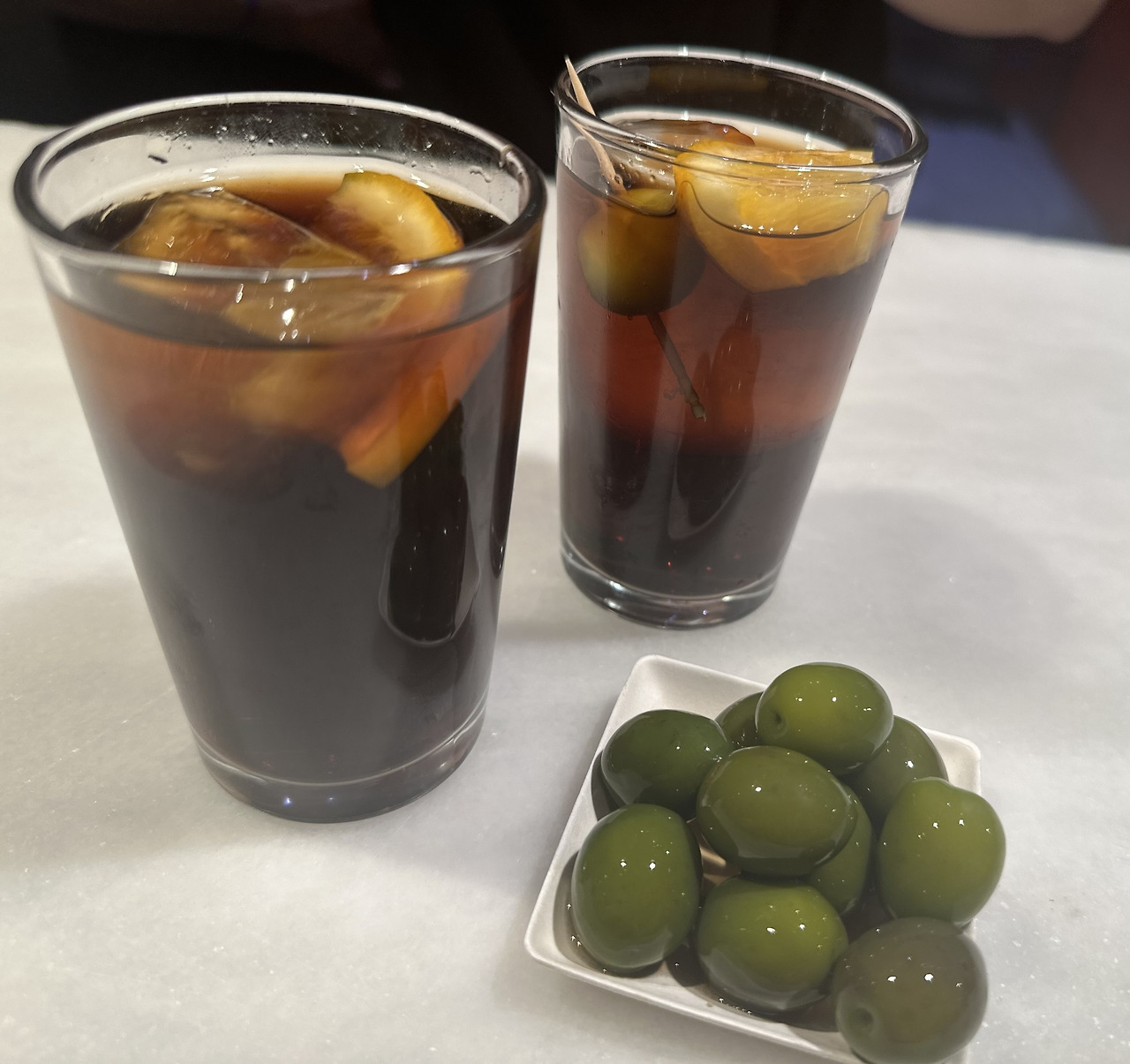 마지막으로 베르뭇을 맛보기 위해 다른 가게로 이동했다. 베르뭇은 와인에 허브와 향료를 추가한 술인데 띤또 데 베르노 보다는 조금 덜 달고, 도수는 조금 더 높다. 은은한 약초향이 나서 술이지만 마시면 몸에 좋을 것 같은 느낌이다. 다들 올리브를 곁들여 먹길래 우리도 함께 먹었다. 올리브가 맛이 없을 줄 알았는데 은근히 매력적이고 생각보다 맛있다. 나도 모르게 하나 둘 계속 집어먹게 된다. 우리가 김치나 나물에 막거리 먹는 것처럼 스페인 사람들은 올리브에 와인을 즐겨 먹는 것 같았다. 우리나라 음주문화처럼 부어라 마셔라, 술이 술을 먹을 때까지 과하게 마시지 않고 기분 좋게 한잔씩 마시며 저녁시간을 즐기는 사람들의 모습이 보기 좋았다.