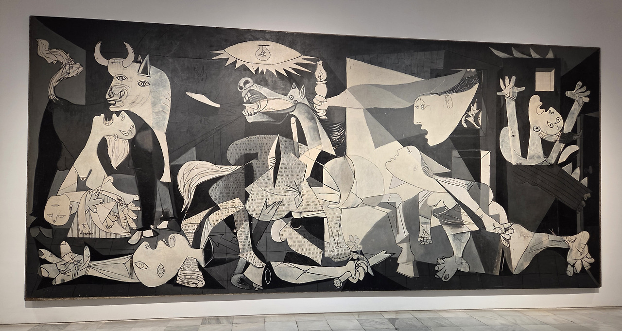미술관 여기저기를 관람하다가 마침내 마주하게 된 게르니카. 이미 많은 사람들이 그 앞에 서 있었다. 그림을 처음 마주한 순간, 전시관 한 면을 가득 채운 압도적인 규모에 놀랐고, 무채색 화면 속에서 생생하게 전해지는 공포와 절규, 슬픔에 숨이 막혔다. 소리 없는 아우성이 이런 게 아닐까. 가이드님이 그림의 여러 부분이 상징하고 있는 것에 대해 설명해 주셨지만 죽은 아이를 안고 있는 여성의 모습이 지금까지도 기억에 남는다. 세계 여러 곳을 돌고 돌아 스페인에 이 그림이 정착하기까지 얼마나 많은 전쟁과 독재, 정치적 상황들로 인한 희생이 이어져 왔을까. 게르니카는 단순한 그림 하나가 아니라, 그 이상의 많은 의미를 담고 있음을 공감할 수 있었다. 많은 말보다 그림에서 전해지는 감정이 더 강렬하고 뚜렷할 수 있다는 것을 실감했다.