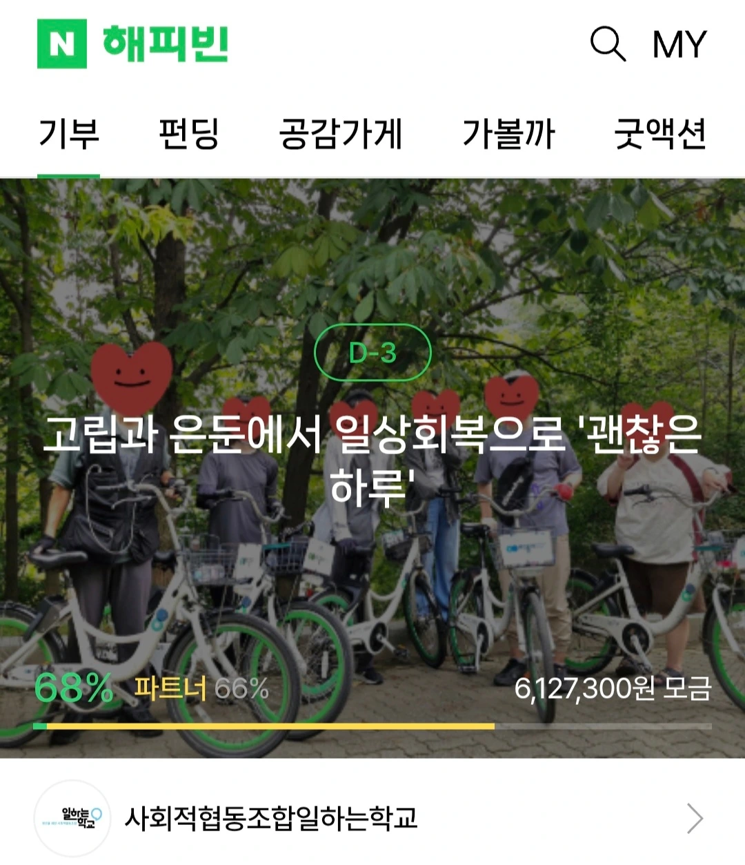 이제 3년간의 지원약정이 종료되어 프로그램 지속을 위한 해피빈 모금을 하고 있어요.