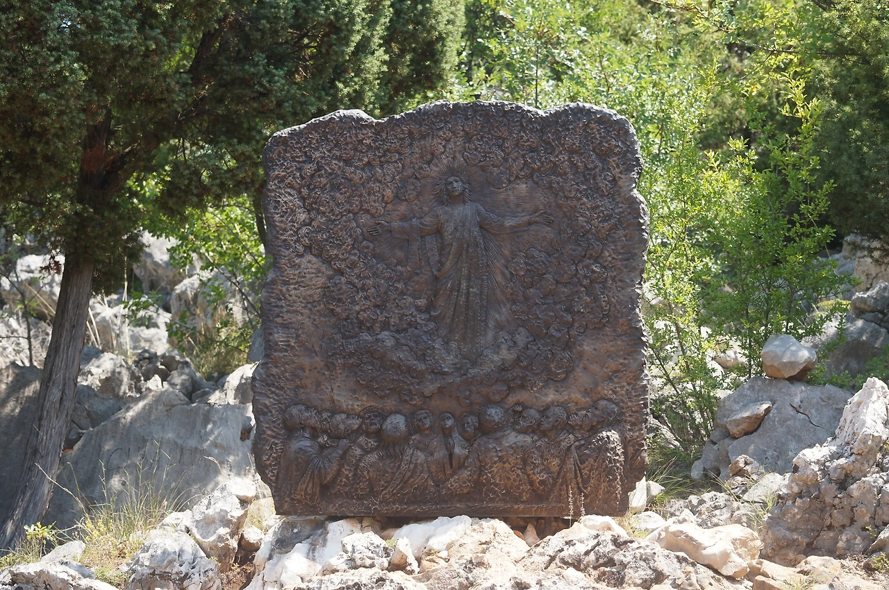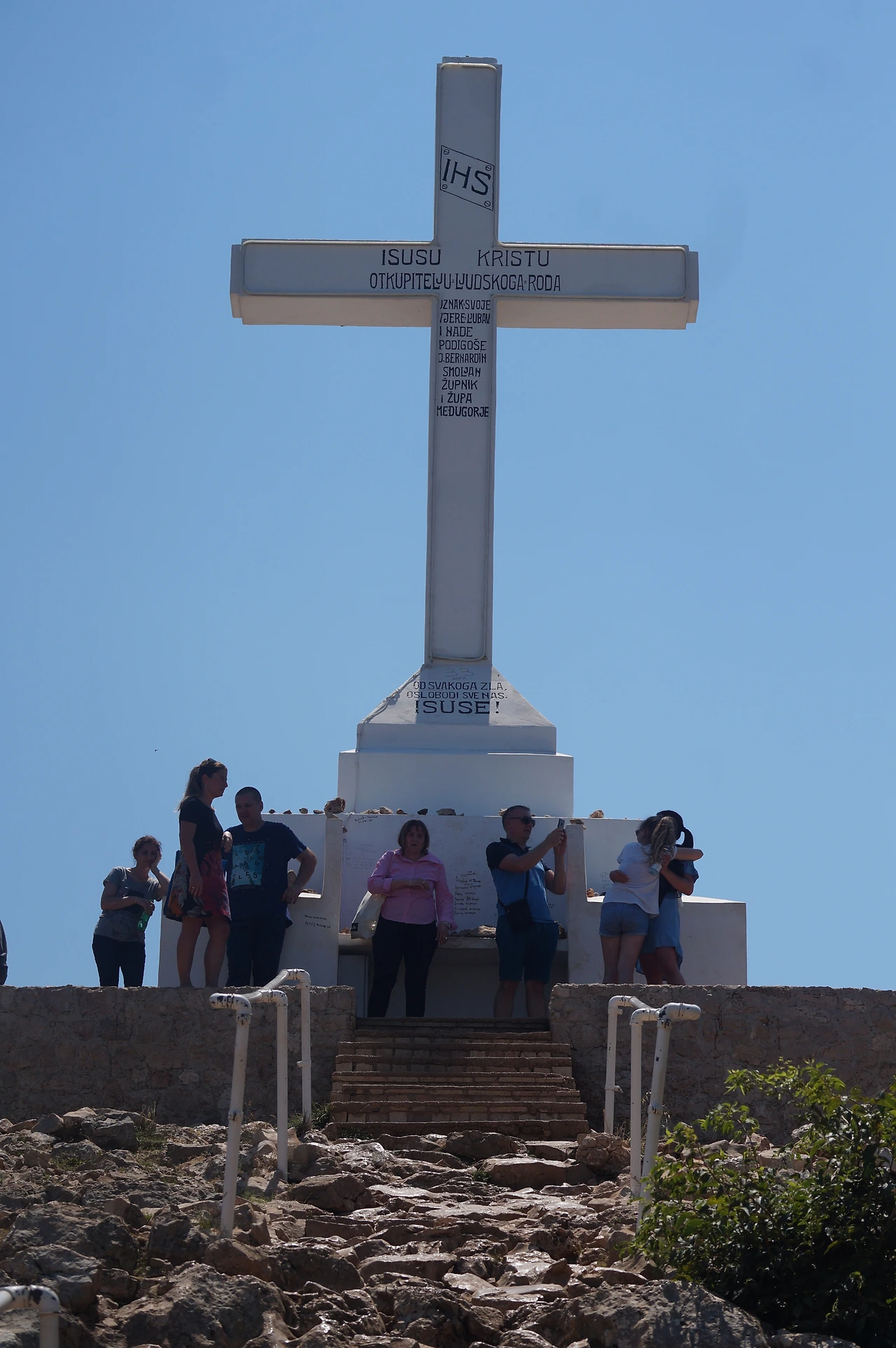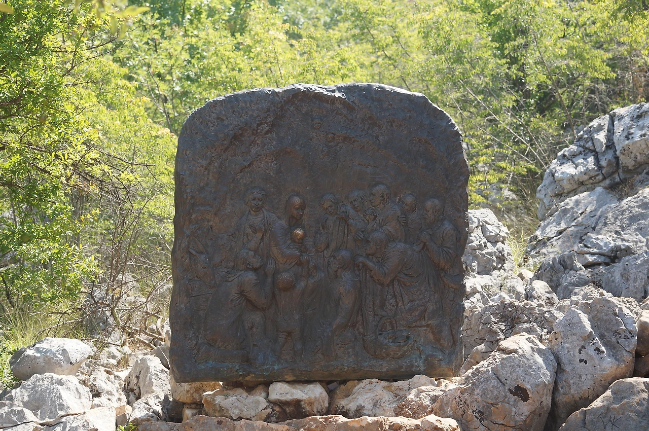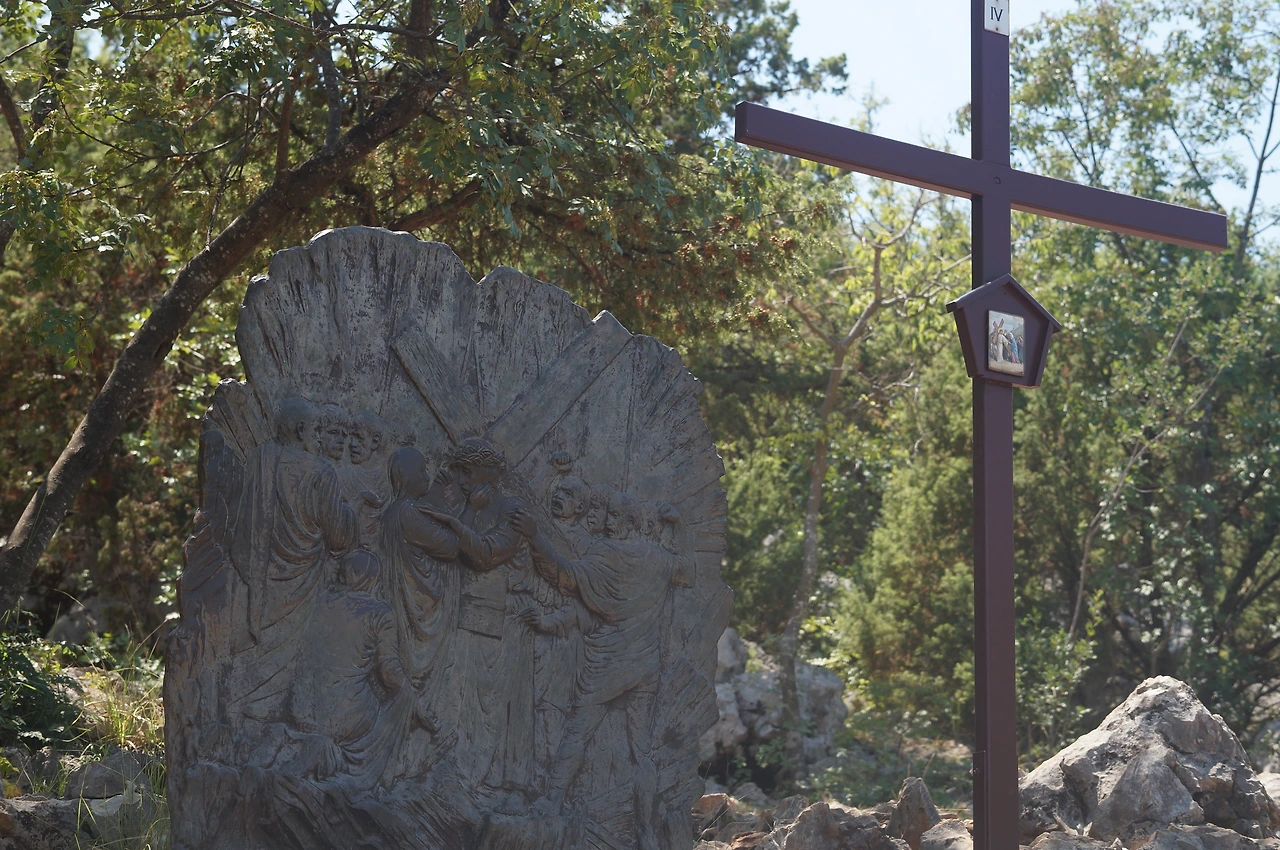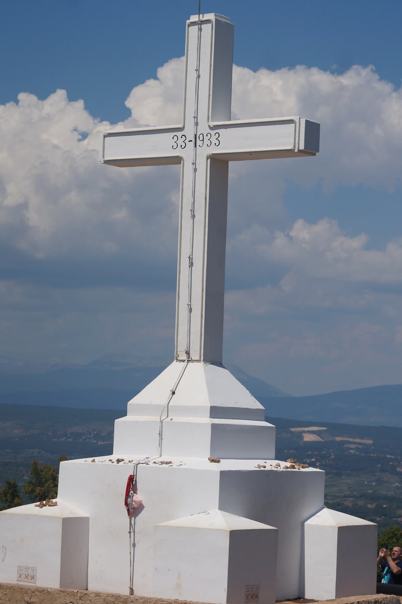 Isusu Kristu, Otkupitelju ljudskog roda, u znak svoje vjere, ljubavi i nade podigoše o. Bernardin Smoljan i zupa Međugorje. (인류의 구세주 예수 그리스도를 위해 믿음, 사랑, 소망의 증표로 베르나딘 스몰랸 사제와 메주고리에가 세움)