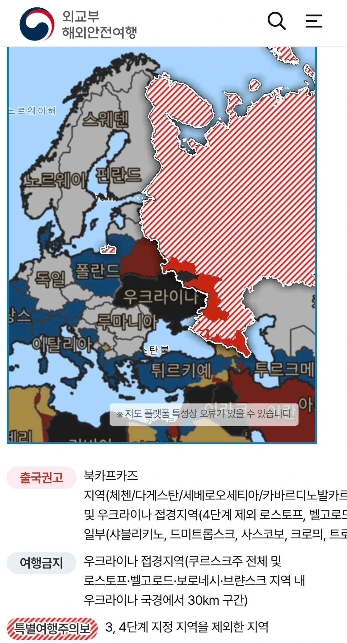 나머지 러시아 영토는 특별여행주의보 지역으로
