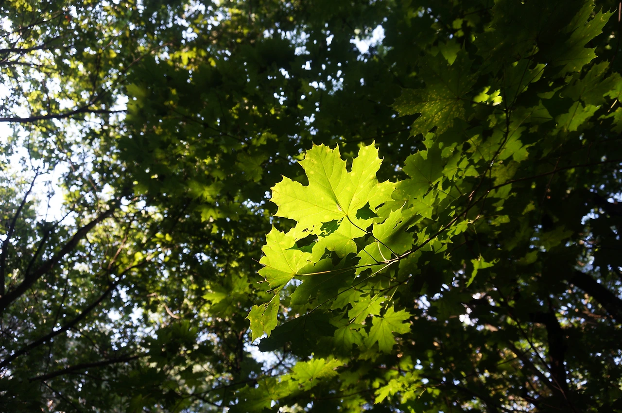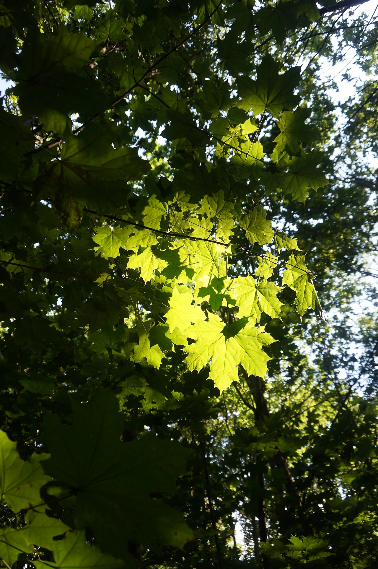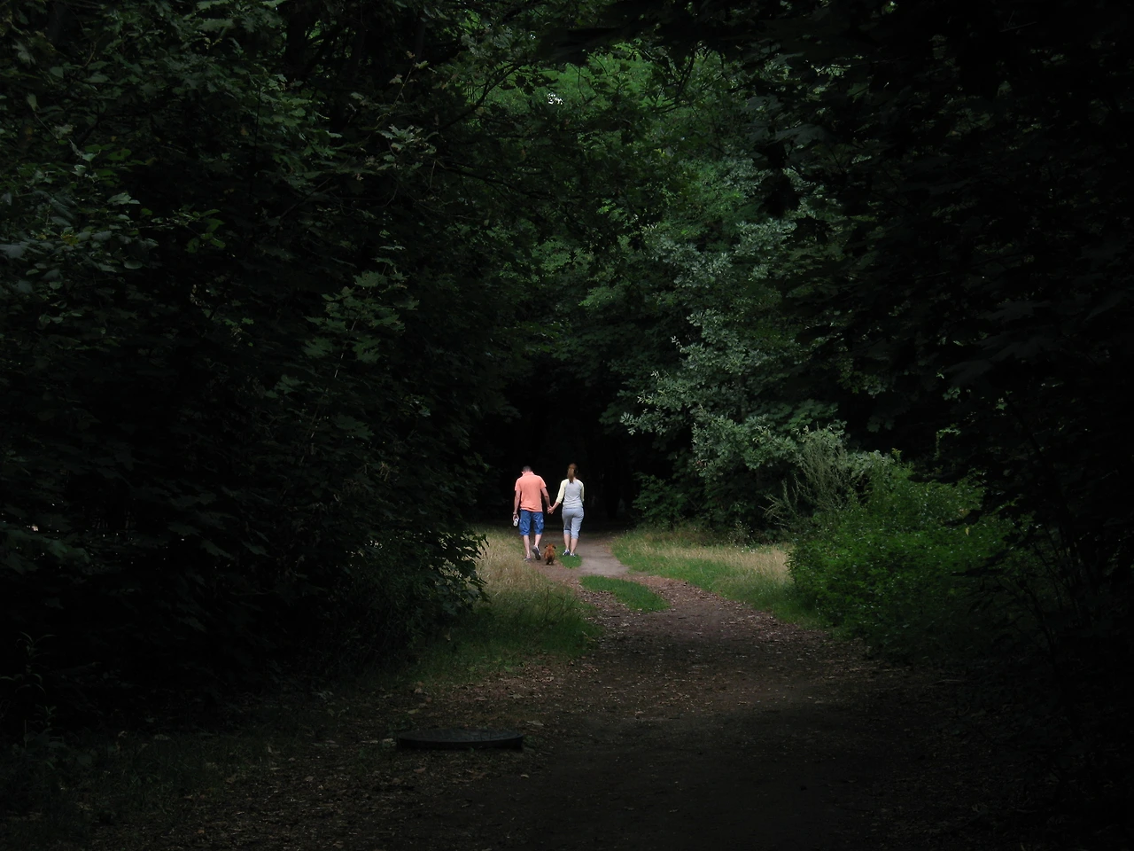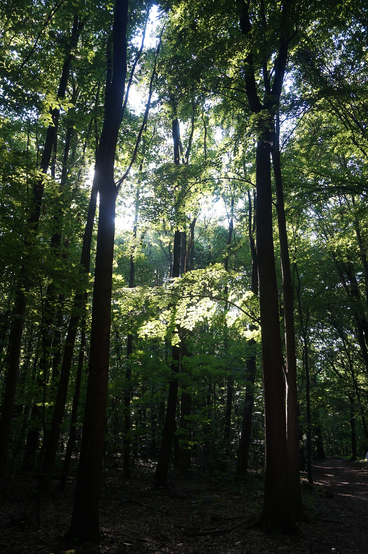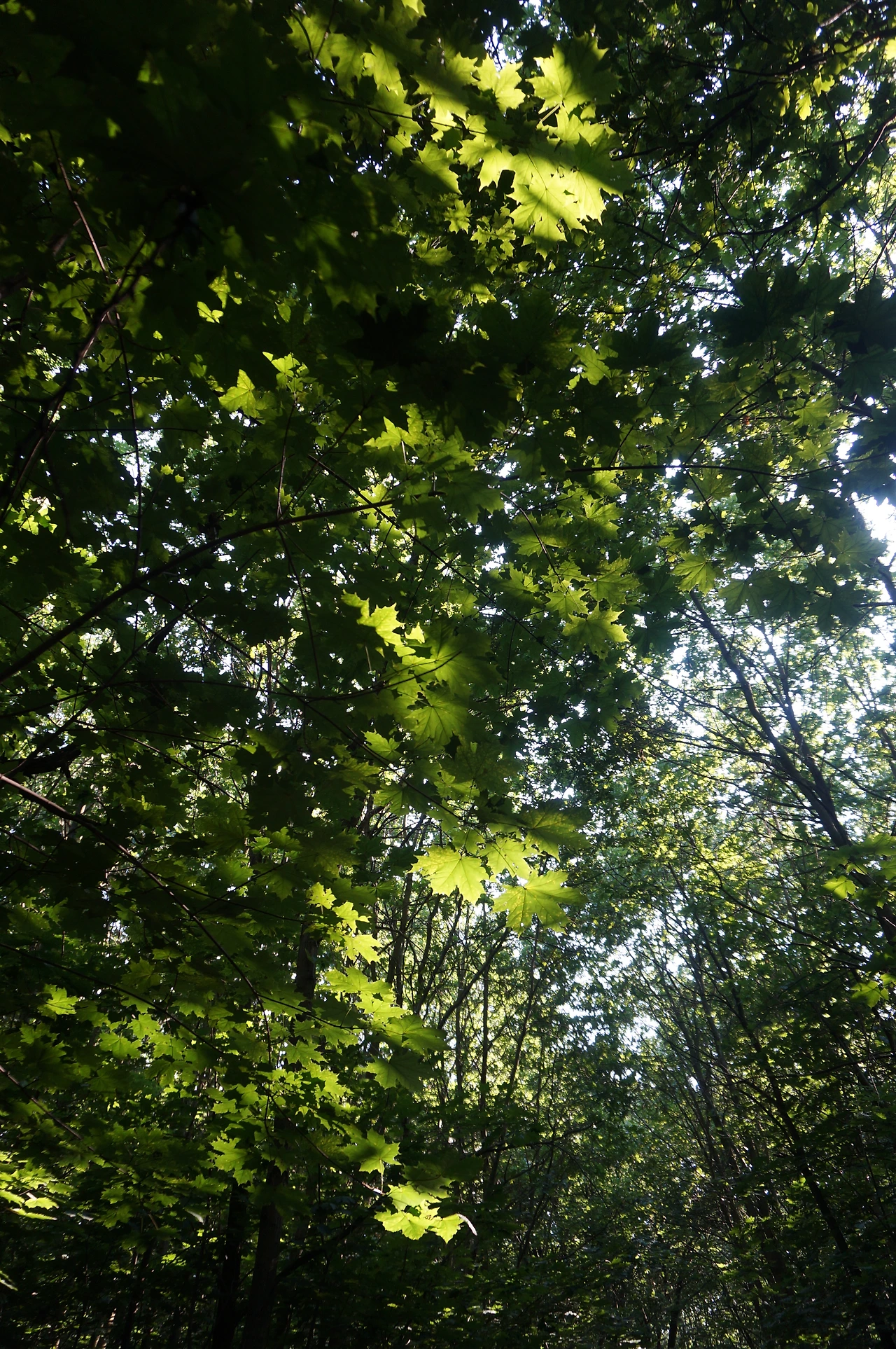 나뭇잎 무성한 커다란 나무 사이를 걸으면서