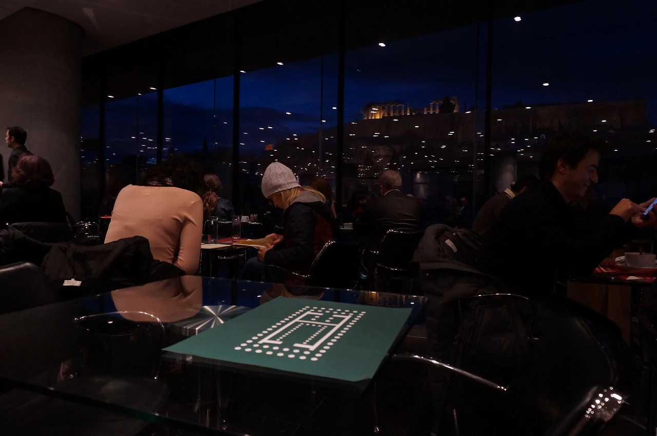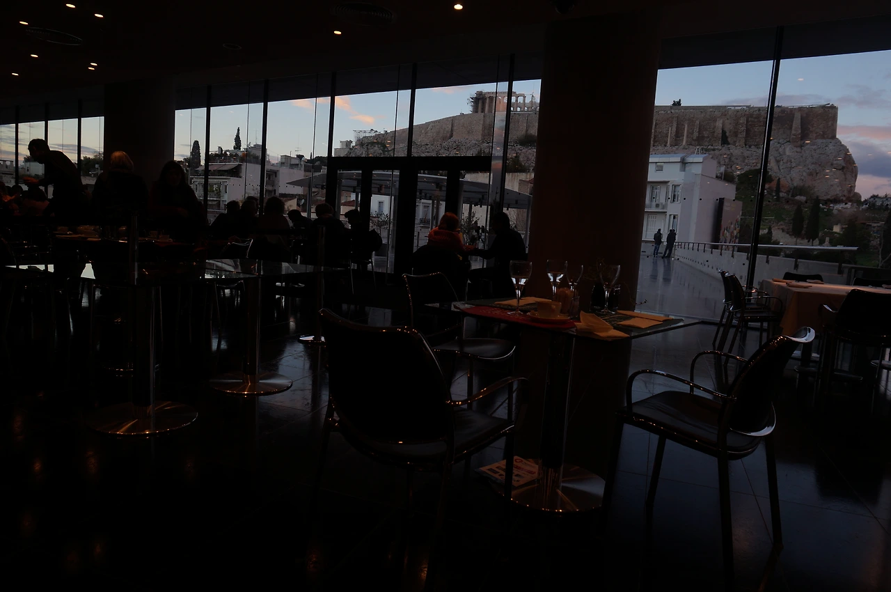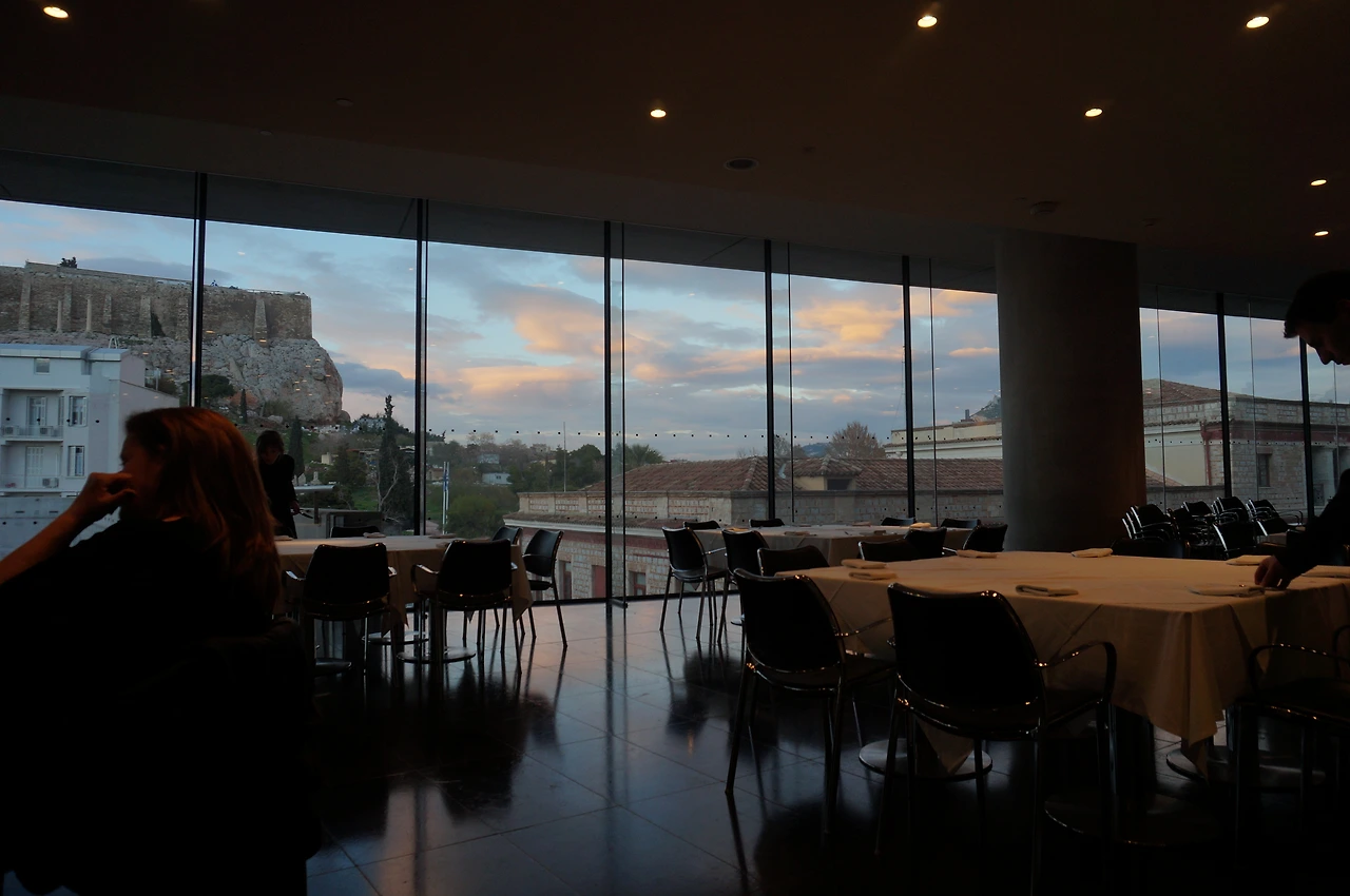 커다란 유리벽 너머로 아크로폴리스가 보인다.
