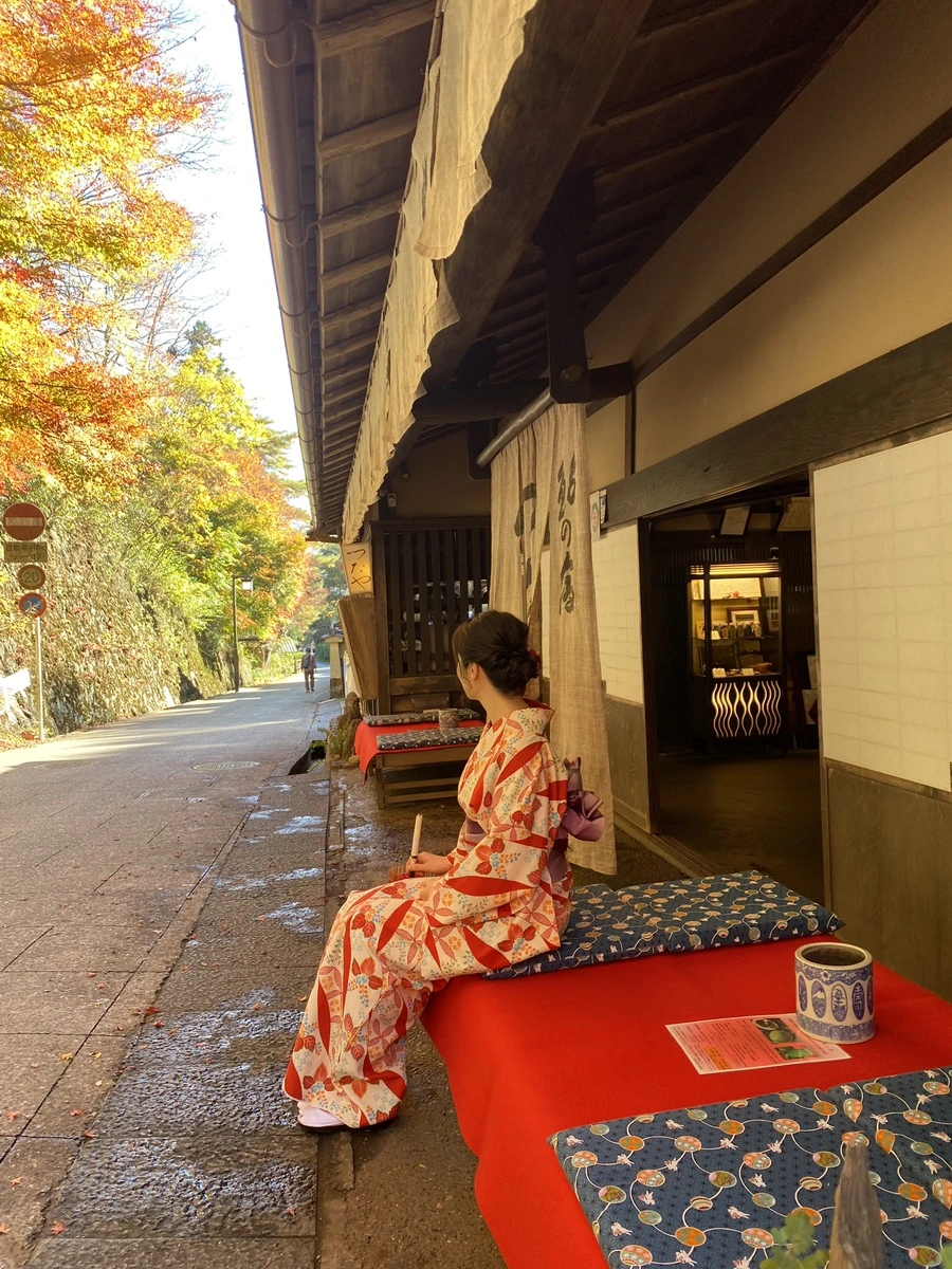 조여 맨 기모노는 생각보다 숨쉬기 괜찮았다(하지만 그걸 입고 어디 앉아 뭘 먹을 생각은 들지 않았음). 하지만 보폭이 좁아질 수밖에 없어서 그 점이 힘들었다. 게다를 신는데, 슬리퍼 같은 형태다 보니 오르막 내리막을 다닐 때는 벗겨질까 봐 조마조마. 평지를 다닐 때는 괜찮았지만 계단이나 내리막길은 힘들다. 게다는 엄지발가락과 검지 발가락 사이에 끈이 있는데 평소에 신지 않는 신발 스타일이라(평소 그런 조리도 안 신음) 살이 쓸릴까 봐 걱정했다. 하지만 반나절만 게다 신고 걸어 다녀서 그런지, 양말 덕분이었는지 딱히 물집 잡히지도 않고 괜찮았음. 그리고 몇 겹을 껴입어서 11월 말의 날씨에도 춥지는 않았다. 목이 휑하긴 했는데, 그렇게 목선을 드러내는 것이 기모노의 묘미라고 하니.. 여행 와서 한 번쯤 해볼 만한 체험인 듯하다.