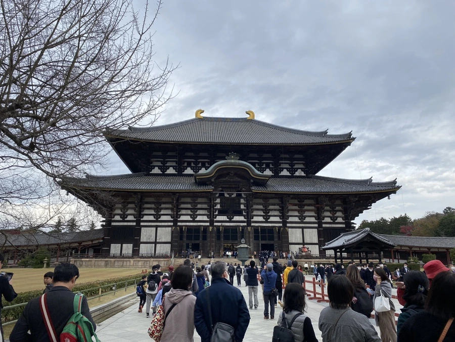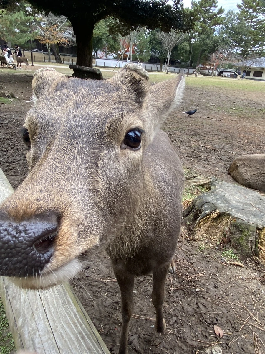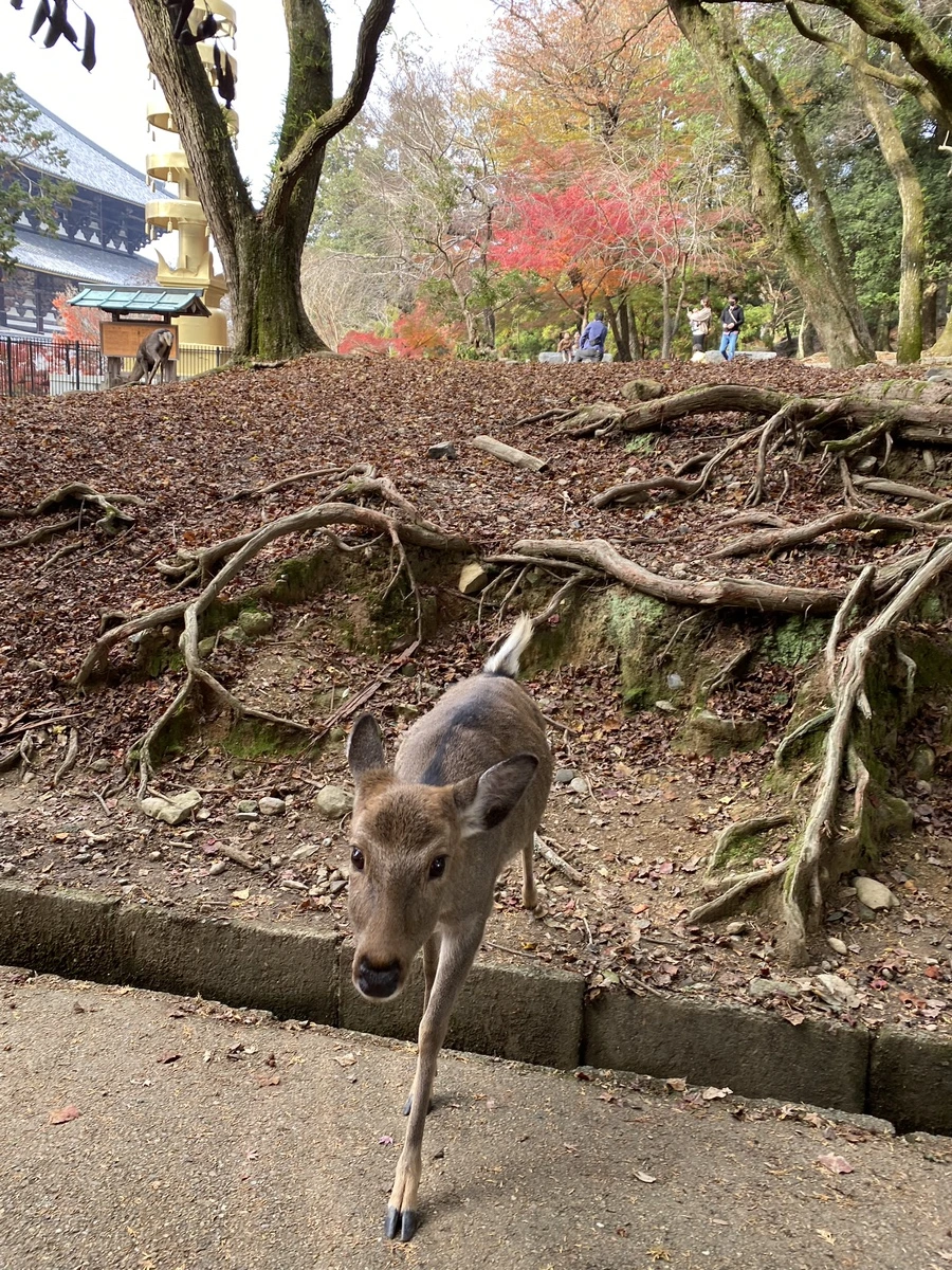친구와 이런저런 수다를 떨며 가니 동대사 도착. 동대사는 일본의 호국불교의 상징이며, 일본 최대의 목조 건물인 ‘대불전’과 최대의 청동불상을 자랑한다. 과연 청동불상은 굉장히 커서 위압감이 느껴졌다. 쉴 새 없이 떠들던 우리도 이 앞에서는 조용해졌다. 동대사에는 관광객도 많고 사슴도 많다. 이것이 진정한 인간과 사슴의 조화일까. 동대사도 멋지지만, 국보나 중요 문화재들이 널린 이곳에 사슴도 함께 자유롭게 뛰노는 모습이 너무 좋아 보였다. 참고로 이곳 사슴들은 길도 잘 건너고(운전자 분들이 사슴이 길을 걷고 있으면 자연스레 멈춰서 기다려 주신다). 공손하게 인사를 해서 전병을 얻어먹기도 한다. 사회생활 만렙이다. 심지어 친구는 사슴이 엘리베이터 타고 내리는 것도 봤다고. 대체 나라 사슴의 정체는 뭐란 말인가!!