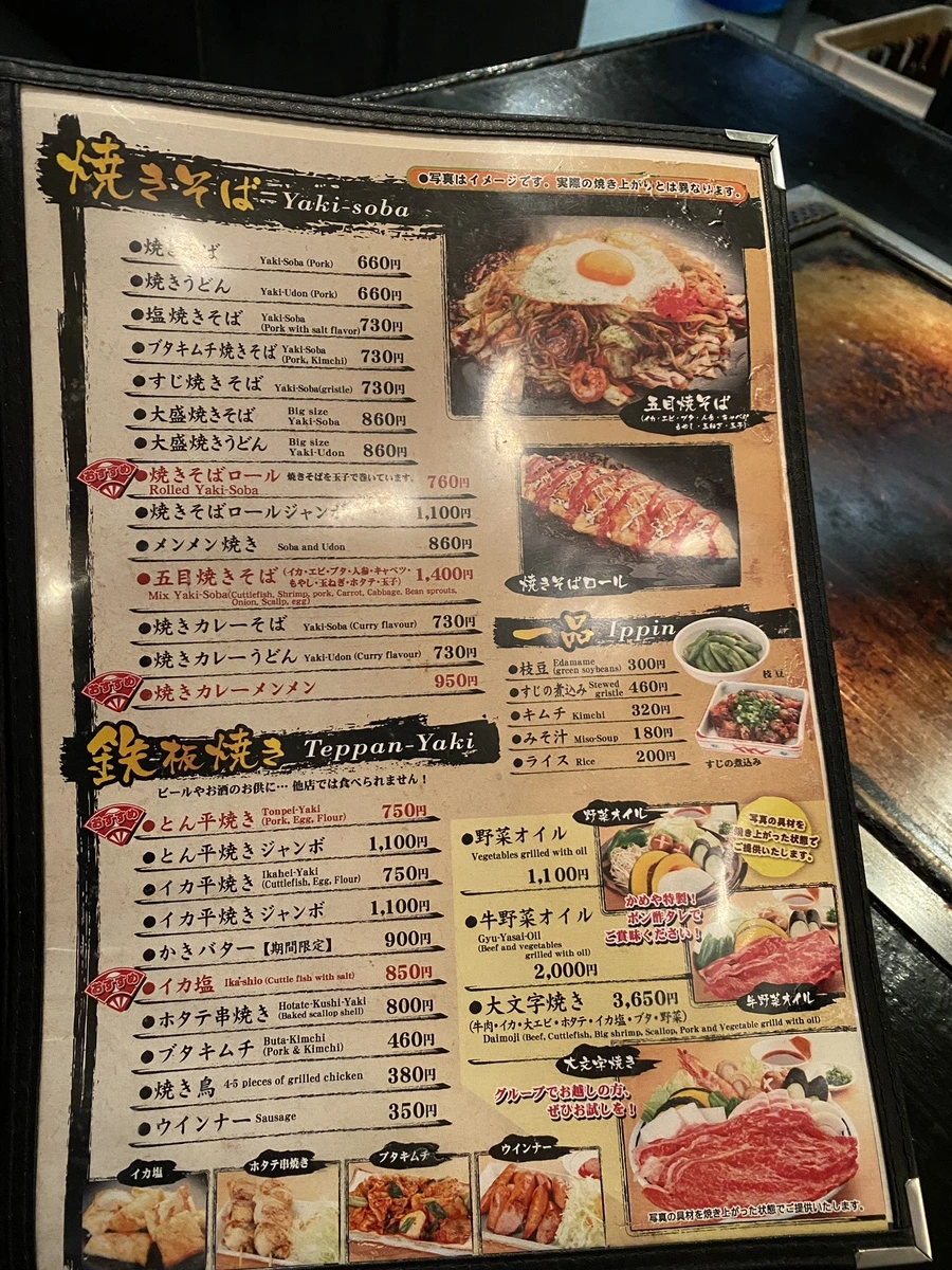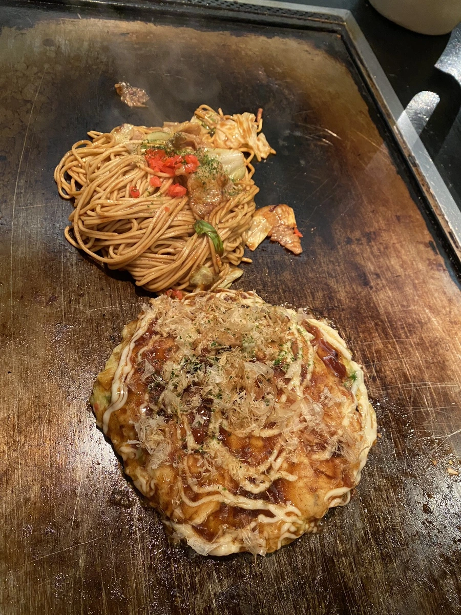 우리는 모치 치즈 오코노미야키와 돼지고기 야키소바, 오렌지주스와 말차를 시켰다. 오코노미야키에 떡이 들어간 식감이 좋았고 맛도 있었다. 야키소바는 좋아하는 얇은 면으로. 이것도 맛있을 수밖에 없지. 간은 역시 내 기준에서는 약간 짠 듯한 느낌이다(나는 음식을 좀 싱겁게 먹는 편이라 웬만한 일본 음식은 다 좀 짜다 ㅋㅋㅋ) 근데 오렌지 주스가 아침에 먹은 오렌지를 직접 갈아 만든 느낌이 아니라 오렌지 가루 주스? 약간 불량 식품 맛이 났다는 거ㅋㅋㅋ 어렸을 때 학교 앞에서 먹었던 맛이 생각나서 오히려 더 좋았다.