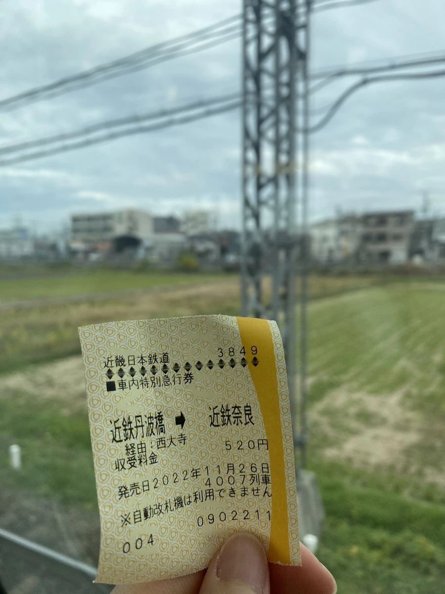 그러나 긴테쓰단바바시역에서는 긴테쓰 특급열차를 타고 나라로 가야 하는데, 특급열차는 별도의 티켓이 필요하다는 것.. 그걸 몰랐던 나는 긴테쓰 특급에 그냥 탔는데, 모두 지정석인 거다. 뭔가 심상치 않은 분위기를 느끼고 객차 사이칸에서 열심히 인터넷을 뒤지다가 긴테쓰 특급 열차는 별도 티겟을 사야 한다는 것을 알게 되었다. 역무원에게 목적지를 말하고 추가 비용을 내면 된다는 내용을 보고, 역무원이 오길래 내 사정을 설명했다. 단바바시역에서 탔는데 특급선은 티켓을 별도로 사야 하는 줄 몰랐다며. 최대한 악의 없는 불쌍한 표정으로 ㅋㅋㅋ 그리고 현장에서 520엔을 현금으로 결제해서 티켓을 받을 수 있었다.
