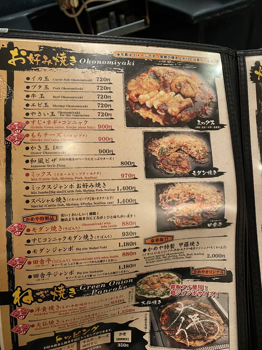 점심은 뭘 먹을까 고민하다 오코노미야키를 먹기로 하고, 상점가인 산조 거리로 향했다. 구글로 검색해서 처음 고른 집은 마침 브레이크 타임이라고 해서 포기. 두 번째로 고른 집은 ‘카메야’라는 곳으로 여기서 약간 늦은 점심을 먹었다.