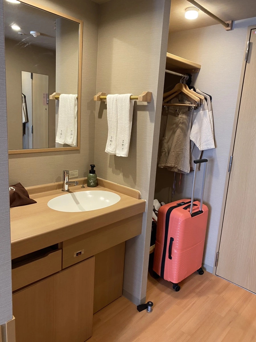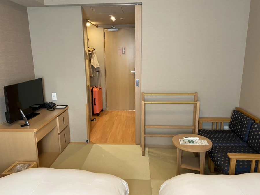객실도 다다미 바닥이었다. 창문은 활짝은 아니지만 비스듬히 열 수 있도록 되어있었고. 나름대로 청결하게 관리하고 있는 듯 하나, 뭔가 모르게 맨발로 다니기에는 찝찝해서 나는 항상 양말이나 수면양말을 신고 다녔다. 위치적으로 좋은 호텔이지만, 시끄럽다는 것이 단점. 아무래도 번화가 쪽이다 보니 오토바이 소리, 차소리가 너무 잘 들렸다. 내가 머물렀던 객실이 5층이라 그런 것일 수도 있지만 바깥 차소리가 시끄러워서 귀마개를 하고 잤다. 교토에서 머물렀던 미츠이 가든 호텔은 번화가여도 약간 골목 안이어서, 그리고 교토 특성상(?) 시끄러운 오토바이들이 안 다녀서 그런지 조용했었는데. 이 호텔은 외부 소음이 있었다는 게 다소 아쉬움. 그것만 아니면 꽤나 가성비 좋은 호텔이라는 생각이 든다.