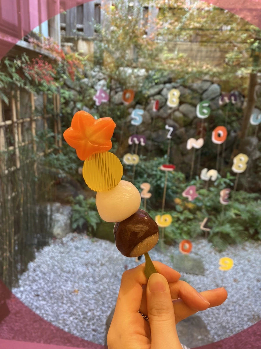 구경을 하고 상점가를 따라 걸어내려 가는데, 하나둘씩 문 연 가게들을 구경하는 재미가 쏠쏠했다. 상점가를 내려가다 오른쪽으로 빠지는 산넨자카로 진입. '킨키키즈의 붕부붕'의 '코다 쿠미'편에서 나왔던 sou sou가 보이길래 냅다 들어갔다. 화과자를 쿠시카츠처럼 꼬치에 꽂아서 걸어 다니면서도 먹을 수 있게끔 한 게 유명하다. 하나 사 먹어봤는데, 보기에도 귀엽고, 양갱/당고 느낌의 식감에 달달해서 한 번에 당충전이 되는 느낌이었다. 계절한정 쿠시화과자 한 개 500엔.