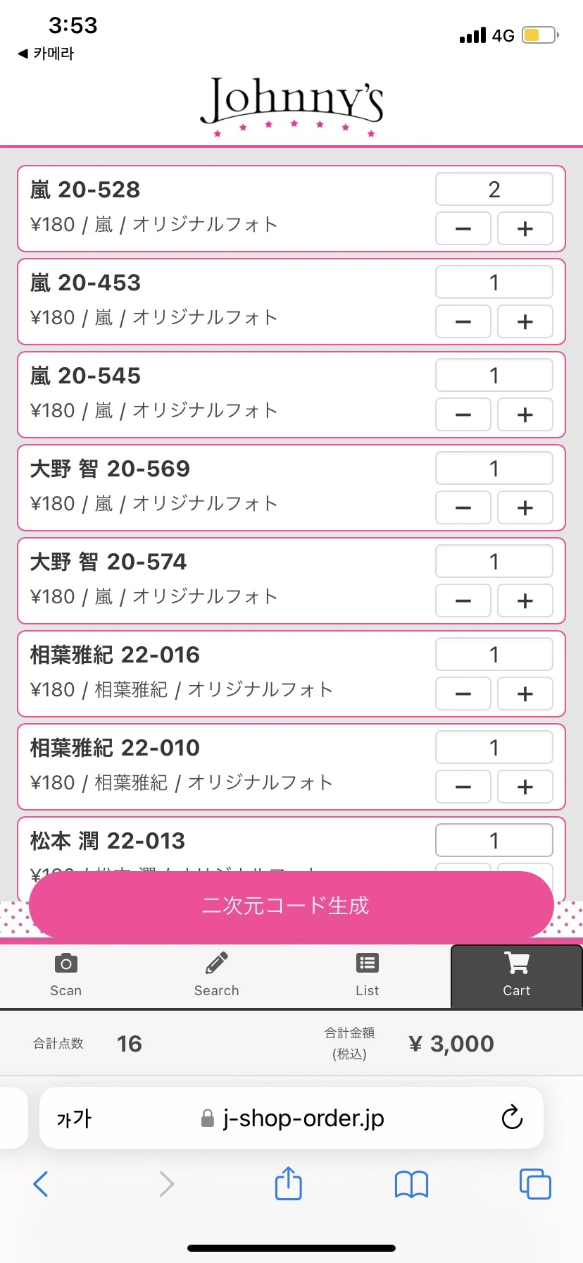 쟈샵을 처음 가본 나도 당황하지 않고 쉽게 이용할 수 있었다. 그룹별로 영역이 나뉘어 있는데, 활동을 쉬는 우리 아라시 구역은 좀 작았다. 그렇지만 있는 게 어디냐며! 다섯 명의 모습이 담긴 샵사와 사토시 샵사 보면서 혼자 마음이 찡해진 덕후… 사토시, 방학 잘 보내고 있니 흑흑ㅠ 그냥 막 담으면 한도 끝도 없을 것 같아서 멤버별로 두장씩만 사야지 했는데 어느새 장바구니는 3000엔을 넘어가고.. 차애인 킨키키즈 것도 두 개 담았다. 오사카라 그런지 몰라도 쟈니즈 중에서 ‘나니와단시’(직역하자면 '오사카 남자')가 유독 인기가 많았던 듯. 팬들도 그 구역에 가장 많았다. ‘그래, 밋치 귀엽지, 류세이 귀엽지’ 하면서도 쇼와우마레에만 관심이 있는 요상한 취향의 덕후는 조용히 계산하러 향했다 ㅋㅋㅋㅋ
