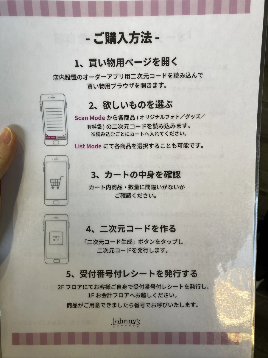 판매하는 제품은 거의 사진이고 일부 클리어 파일과 굿즈도 있다. 구매하는 방법은 입장 전에 직원분이 안내해 주셨는데, ‘오더 어플’이 따로 있고 여기에 들어가서 각 사진에 붙어있는 미니 QR을 휴대폰 카메라로 찍으면 내 어플 속 장바구니에 담기는 식이다. 이 얼마나 하이테크인지!