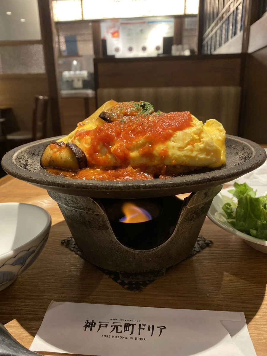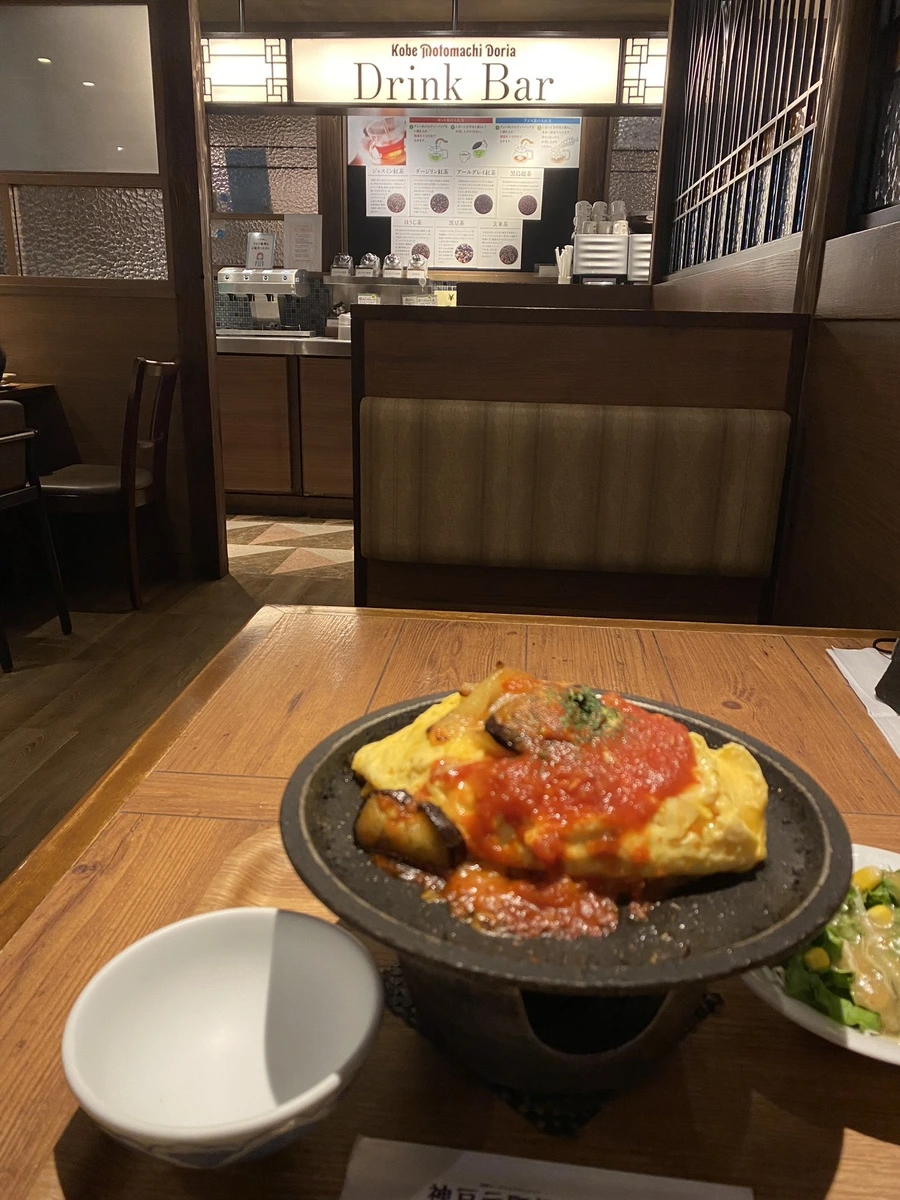 고베의 모토마치가 번화한 상점가라던데. 고베는 못 갔지만 도리아는 먹어보자는 생각 ㅋㅋㅋㅋㅋ 메뉴판을 보다가 런치 세트로 ‘가지 토마토소스 오므라이스’를 주문했다. 319엔을 추가하면 드링크 바를 이용할 수 있다고 해서 그것도 추가. 식당 분위기는 백화점 식당가 같았는데, 나처럼 혼밥 하러 온 여성분들이 많았고, 아이를 데리고 오셨거나 친구와 식사하는 분들도 계셨음.