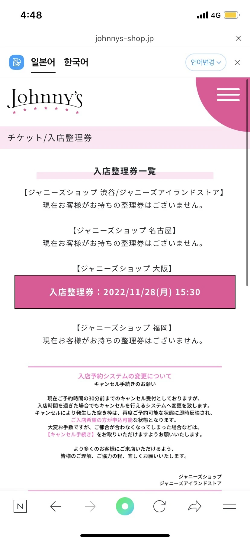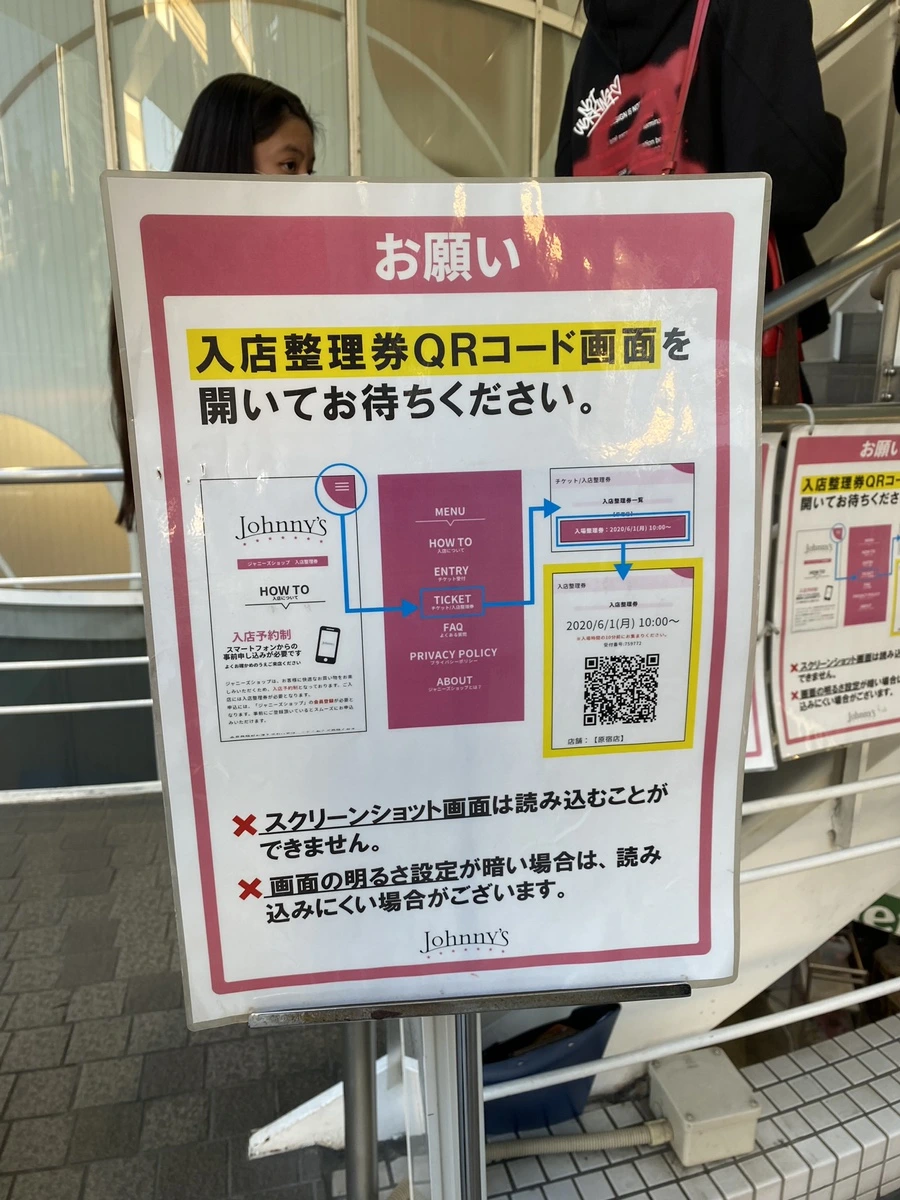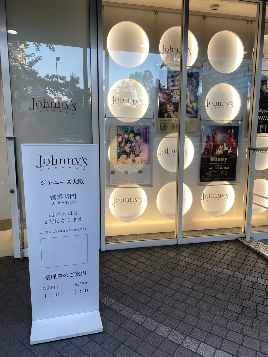 사실상 오늘의 하이라이트였던 쟈니즈 샵. 오사카에는 우메다에 있는데, 실은 어제 우메다에 온 김에 방문하려 했더니 사전 예약제라는 것. 사전에 홈페이지에서 방문 날짜와 시간대를 지정하고 예약 확정을 받아야 들어갈 수 있다는 거다. 이 사실을 몰랐던 나는 황급히 가게 앞에 안내되어있는 QR 코드를 통해 쟈니스 샵 홈페이지로 들어가서 후다닥 방문 일정을 잡았더랬다. 다행히 월요일 오후 3시 30분 시간대가 비어있어서 예약할 수 있었다. 하마터면 덕후가 성지를 못 들어가 보고 눈물만 흘리다 올 뻔!