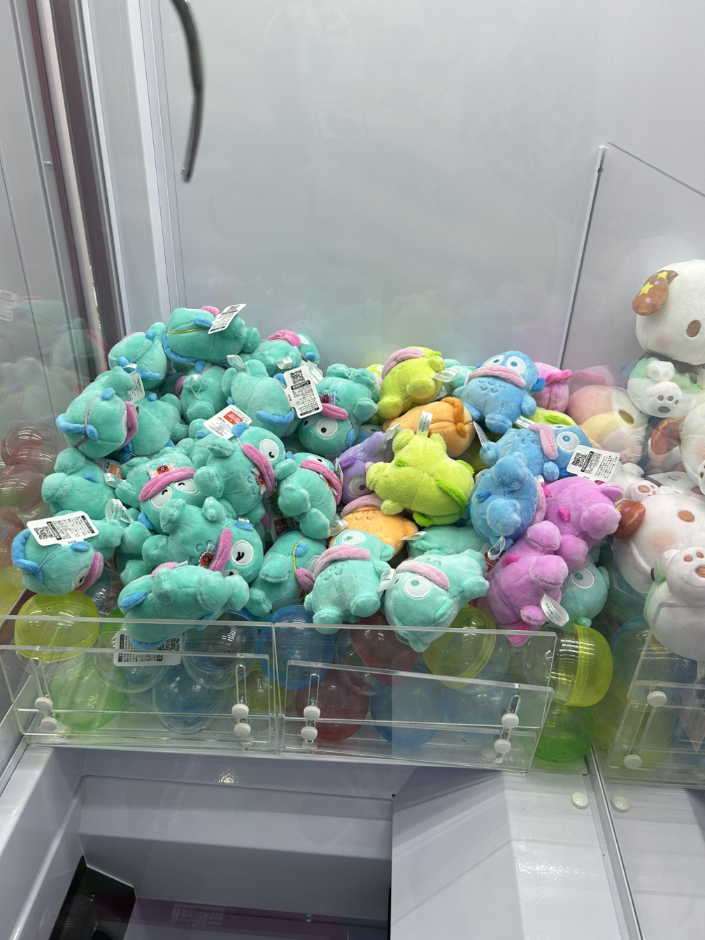포챠코 캐릭터 그리팅이 12시 30분이었는데, 밥 먹고 시간이 많이 남아서 나머지 구역들을 구경했다. 돌아다니다 보니 인형 뽑기 기계들이 보여서 홀린 듯 입성. 인형 뽑기는 못 참지! 크기에 따라 100엔부터 시작하는 인형 뽑기. 색색깔 알록달록한 한교동이 쌓여있는 걸 보고 눈 뒤집혀서 달려들었으나 5번을 시도해도 실패. 포챠코도 여러 번 시도해 봤으나 실패. 1000엔까지만 쓰자고 다짐했기 때문에, 빈손으로 터덜터덜 걸어 나왔다. 역시 인형 뽑기의 세계는 냉정해... 여기 기계의 집게들이 전반적으로 헐겁다는 것을 알았지만, 하나라도 건지고 싶어서 포기할 수 없었다. 하지만 즐거웠다!
