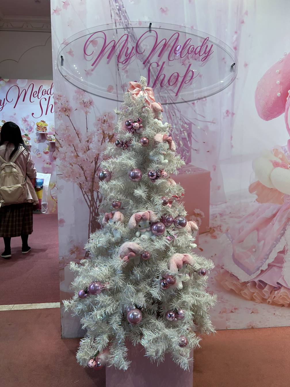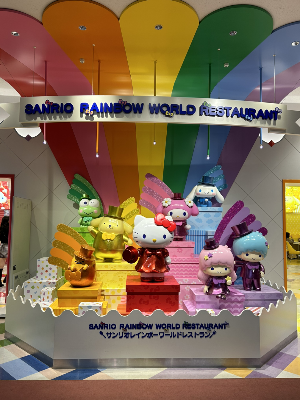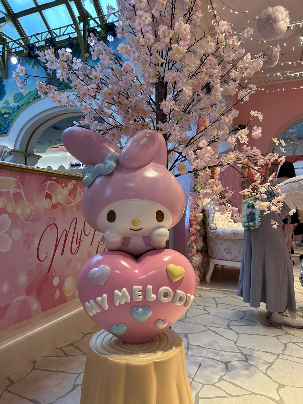 어트랙션을 벗어나 나오니 쇼를 하고 있었다. 앙증 깜찍한 퓨로랜드인 줄 알았건만, 공중 곡예쇼라니.. 그 다이내믹함에 놀라며 구경을 조금 하다가 밥을 먹으러 가기로 했다. 4층에 식당이 있어서 4층으로 올라갔는데, 여기저기 귀엽게 꾸며진 캐릭터 존들이 시선을 사로잡았다. 특히 마이멜로디 샵에서는 분홍색 마이멜로디 트리에, 인형에, 핑크공주들 눈물 흘릴만한 귀여운 포토스팟들이 많았다. 마이맬로디 굿즈샵에서 정면으로 헬로키티 동상(?)이 보이는데, 산리오의 레전드 헬로키티의 위엄이 느껴졌다. 확실히 전 세계적으로 가장 히트한 산리오 캐릭터는 헬로키티일 테니까. 개국공신 같은 포지션이 아닐까.