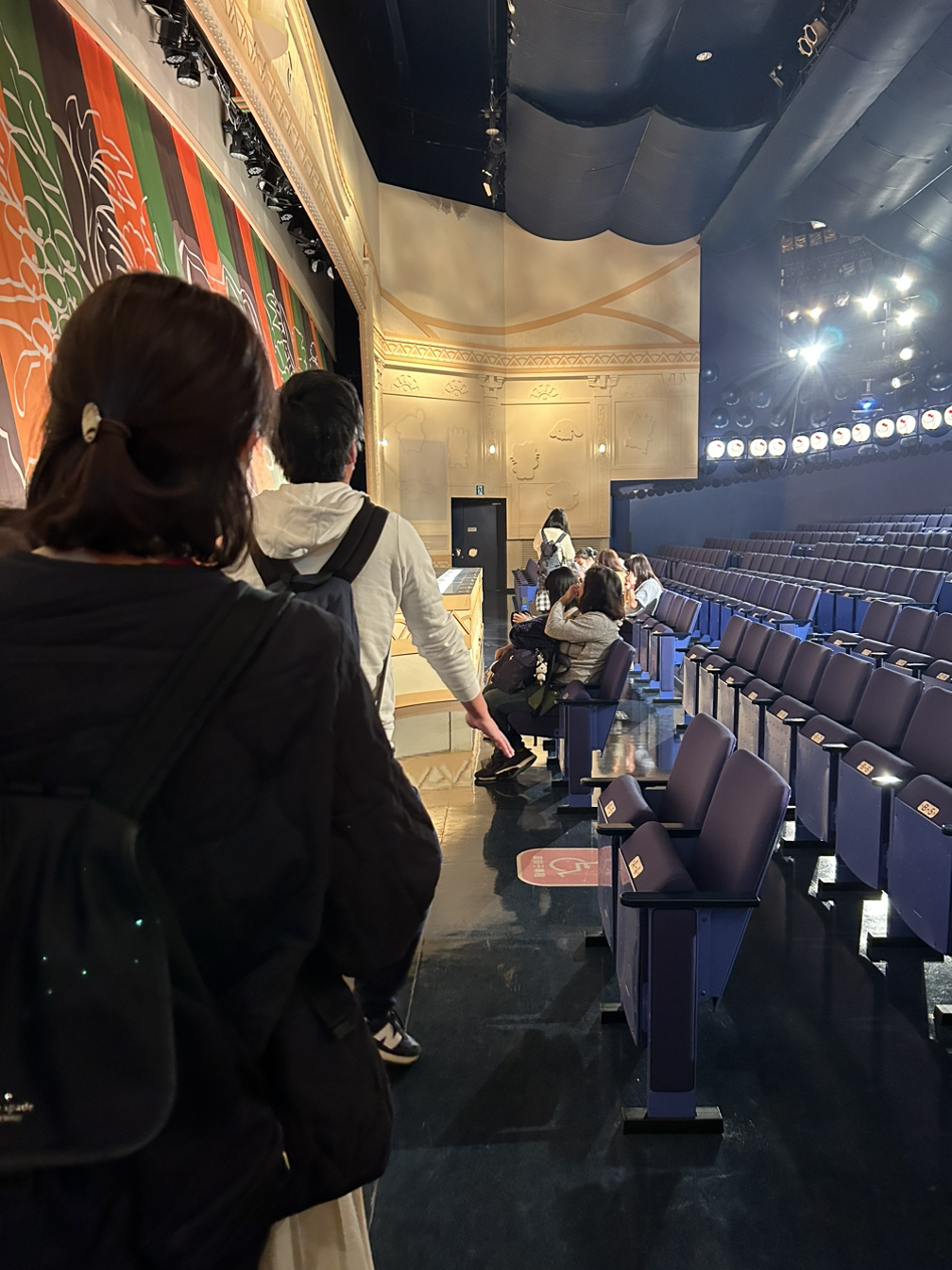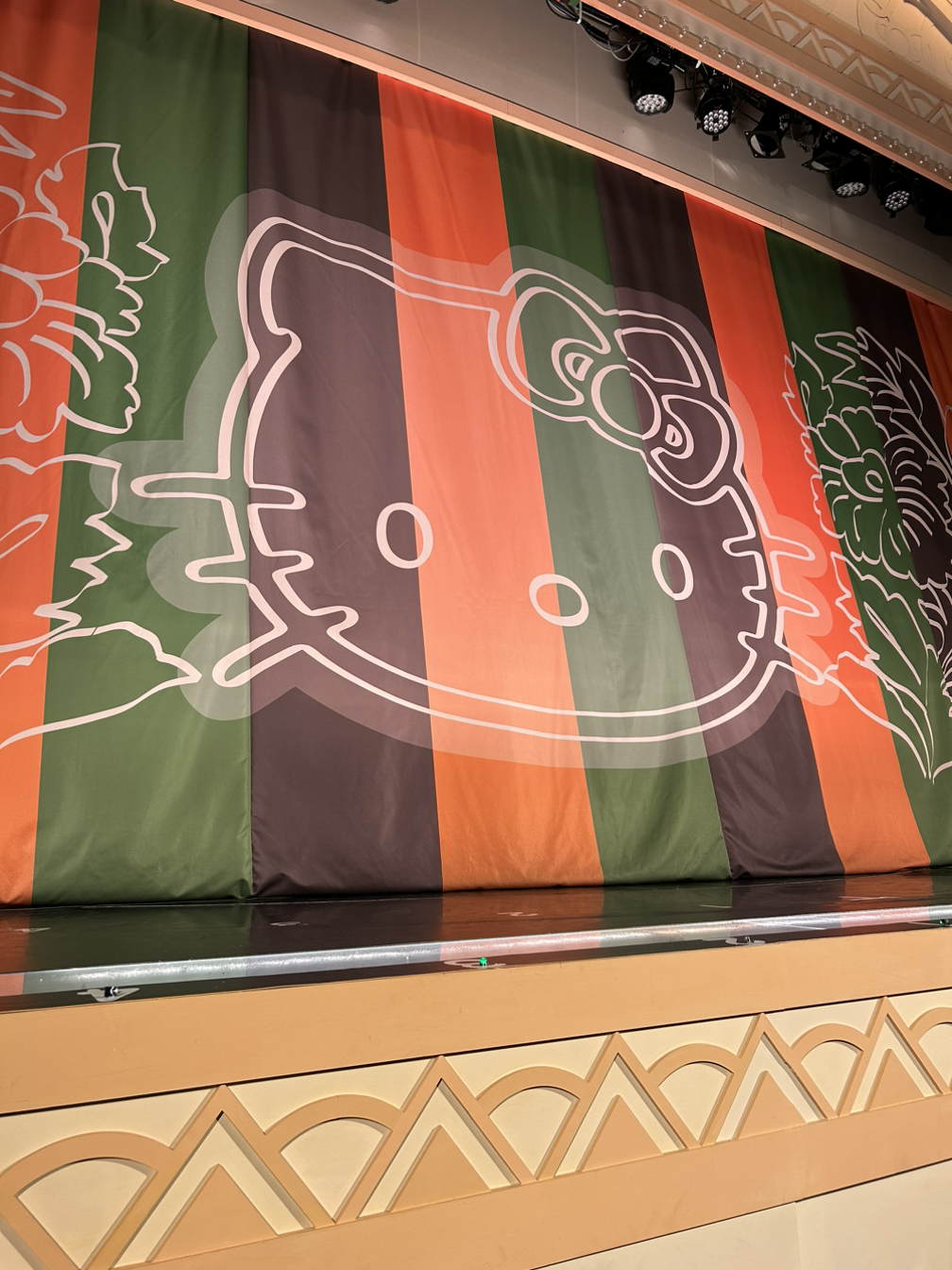 가부키 공연을 본 적이 없어서 설렘이 더 컸다. 무대에는 막이 쳐져 있었는데, 일본풍 색조합에 헬로키티 얼굴이 딱! 잠시 기다리니 무대 양쪽의 모니터를 통해 본 공연 중에는 사진이나 동영상 촬영이 안된다는 안내 영상이 나왔다. 이어서 정말로 가부키 시작 전 관객들을 끌어올리는 역할을 하는 사람이 나와서 호응하는 법을 알려주었다! 가부키는 배우와 관객이 함께 호흡하며 진행되는 극으로, 예를 들어 배우 A가 명장면을 만들어 내면 관객이 '닛폰이치(일본제일) A!', 'A!' 하면서 이름을 소리 쳐준다. 그게 관람 매너인 듯. 하지만 가부키 처음 보는 외국인인 나로서는 그렇게 소리 지르는 게 너무 부끄러워서.. 박수만 열심히 쳤다! 그렇게 살짝 얼굴이 달아오르는 연습을 거친 후, 본격적인 공연이 시작되었다.
