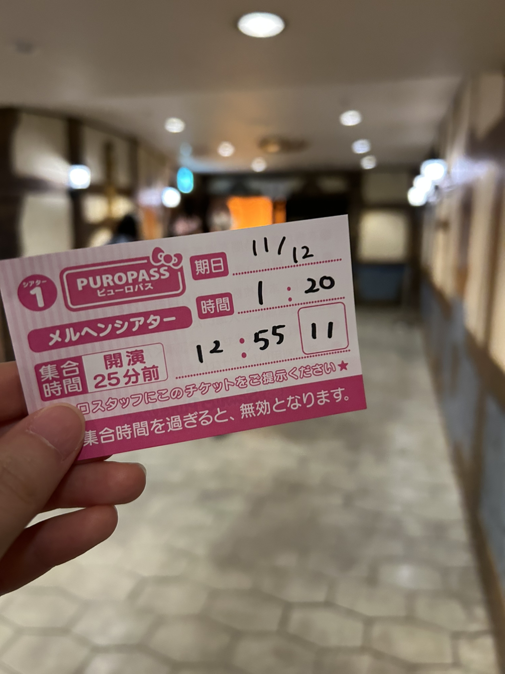 포챠코와의 감동적인 만남을 마치고 나오니, 기운이 쪼옥 빠지는 느낌이었다. 점심시간이 지나가면서 사람은 더 많아진 느낌. 퓨로랜드에서는 여러 가지 쇼도 진행되는데, 쇼 시간표를 보다가 '카와이이 가부키'라는 공연을 보기로 했다. '카와이이 가부키'는 직역하자면 '귀여운 가부키'라는 뜻일 듯한데, 산리오의 캐릭터들이 가부키 공연을 하는, 신선한 콘셉트의 공연이다. 퓨로패스를 구매할 수 있는 쇼로 분류되어 있고 패스로 먼저 입장해서 좋은 자리에 앉을 수 있기 때문에, 2층 퓨로패스를 파는 카운터에서 1000엔짜리 퓨로패스를 샀다. 지정석은 아니고 우선 입장권 개념. 구매하면 퓨로패스에 숫자를 써주는데, 내 숫자는 11번으로 11번째로 입장할 수 있다는 의미이다. 카와이이 가부키는 '메르헨 시어터'라는 공연장에서 진행되기 때문에, 공연 시간 10분 전에 메르헨 시어터 앞에 서 있었다. 기다리고 있으면 직원 분이 퓨로패스를 순서대로 불러서 줄을 세워주신다. 그리고 일반 입장 전에 먼저 들어갈 수 있게 해 주셔서, 맨 앞 가운데 앉을 수 있었다.