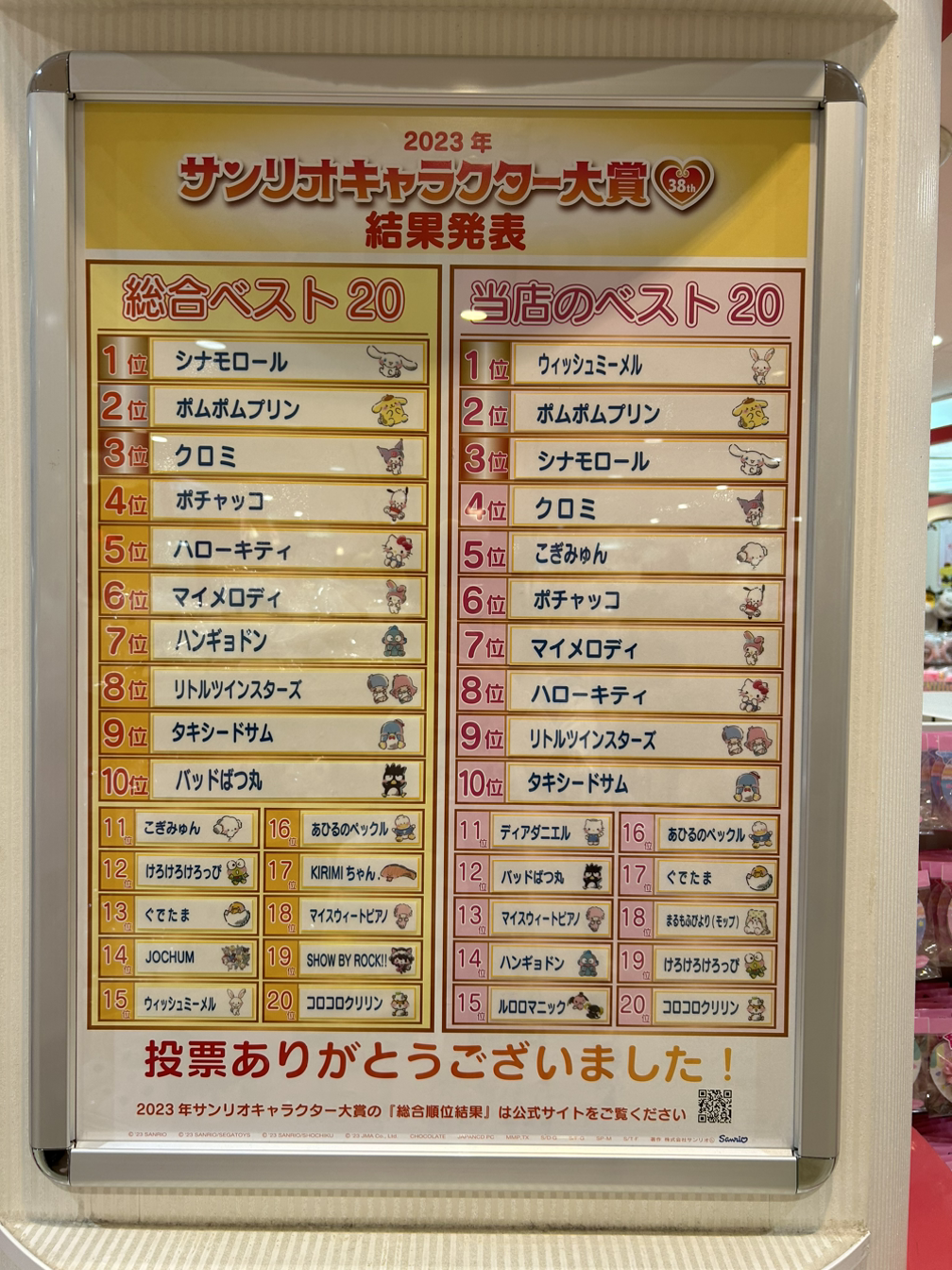 기념품 샵 안에 산리오 캐릭터 대상이라고 인기투표 결과가 종합 베스트/산리오 퓨로랜드점의 베스트로 나뉘어 걸려 있었는데, 우리 포챠코는 종합 4위, 산리오 퓨로랜드점 6위! 한교동은 7위, 14위였다. 일본은 참 인기투표 좋아한다니까. 근데 만화든 캐릭터든 이런 인기투표 진행한 결과는 흥미진진하긴 하다. 순위를 보고 내가 좋아하는 캐릭터를 더 응원하게 되기도 하고. 어찌 됐든 팬들 조련을 참 잘하는 일본 캐릭터 산업계. 산리오 팬인 사람이라면, 특히 어린이라면 이 엔트런스 샵에서 눈 뒤집힐 모습이 눈에 선하다. 기념품 샵은 2층에도 있지만 3층 메인 기념품샵이 훨씬 크니 구경은 3층 기념품샵에서 하길 추천한다. 다만 귀여운 얼굴을 하고 악랄한 가격을 붙이고 있기 때문에, 마음 단단히 먹으시길!