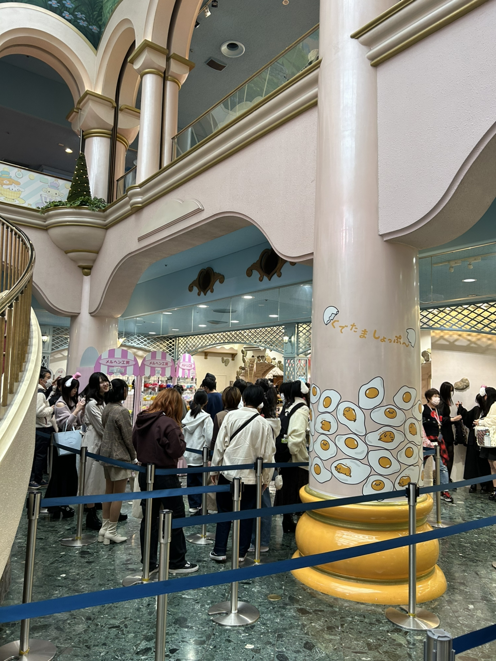 입장층이 3층인데, 오른쪽을 보면 산리오 캐릭터로 네임 플레이트를 만들 수 있는 '메르헨 공방'이 있고, 그 옆엔 엔트런스 샵(기념품 샵)이 있다. 산리오 네임 플레이트는 어떤 일본 남자 아이돌이 하고 나와서, 팬들 사이에 엄청 붐이 일었다고 한다. 내가 간 날도 이른 오전 시간이었는데도 네임 플레이트를 만들려는 사람들이 길게 줄을 서 있었다. 나도 꽤나 빨리 도착했다고 생각했는데, 이 사람들은 대체 몇 시에 온 걸까!