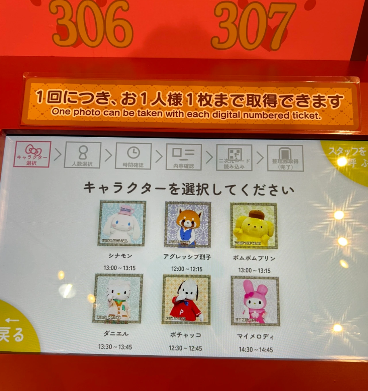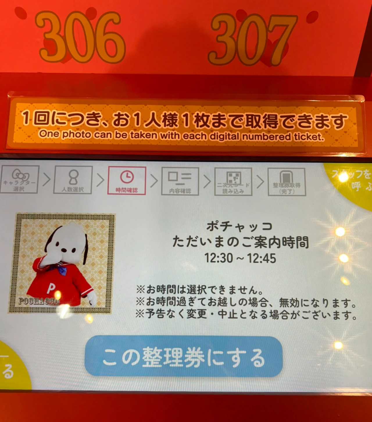포챠코를 머리에 쓰고, 가방에 걸고 캐릭터 샵을 나왔다. 퓨로랜드에서 캐릭터 그리팅을 꼭 하고 싶었는데, 그리팅 예약은 2층에서 할 수 있다. 실내가 복잡한 편이라 처음에는 길을 찾기 힘들지만, 직원분한테 물어보면 친절하게 알려주신다. 캐릭터 그리팅은 키오스크로 고객이 직접 예약 등록하게 되어 있어서 줄부터 섰다. 순서대로 비어있는 키오스크에서 그리팅 티켓을 예약하게 되는데, 처음에는 캐릭터를 선택한다. 캐릭터 별로 만날 수 있는 시간이 정해져 있으니 이 점도 고려. 캐릭터를 선택하면 입장 인원을 입력하고 선택한 내용이 틀림없는지 확인하는 단계를 거쳐 정리권을 받을 수 있다. 정리권은 키오스크 화면에 QR 코드가 보이는데, 이걸 휴대폰으로 촬영해서 내 폰에 저장해 두면 된다. (캐릭터 그리팅 현장에서는 직원 분이 해당 정리권이 나온 사파리 화면도 확인하셨다)