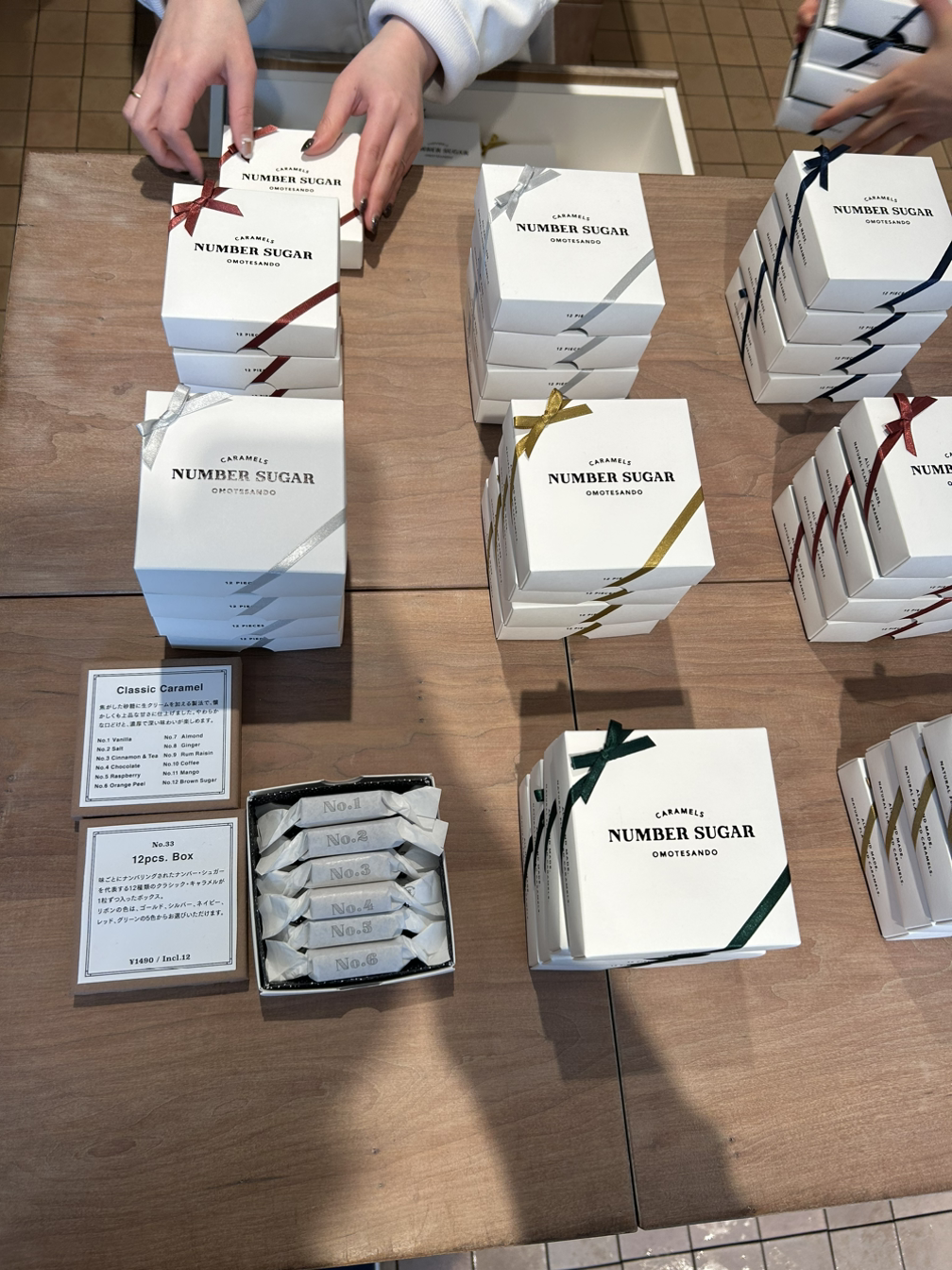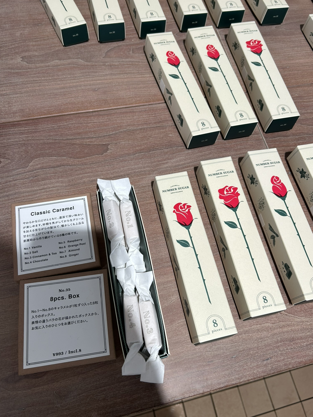 패키지가 예뻐서 선물용으로 인기가 많은 듯하다. 나도 작년에 도쿄 여행 다녀온 친구로부터 여기 제품을 선물 받았다. 먹어보니 여러 가지 맛을 비교해 가며 먹을 수 있는 게 좋았어서, 이번에는 직접 구매하러 온 거였다. 주변에 선물로 줄 겸 8개입 세트를 세 개 샀다. 8개입은 박스에 장미가 그려져 있어서 이쁘다. 가격은 993엔. 개인적인 취향으로 1번 바닐라, 2번 솔트, 6번 오렌지필이 특히 맛있었다. 캬라멜은 적당히 말랑 끈적하고 입 안에서 쉽게 녹는다. 중독성이 있어서 앉은자리에서 여러 개 까먹게 되는 맛. 고급스럽고 맛도 좋고 크기도 작아서 선물용으로 제격이다. 수제 캬라멜이니 유통기한이 짧은 점은 유의할 것.