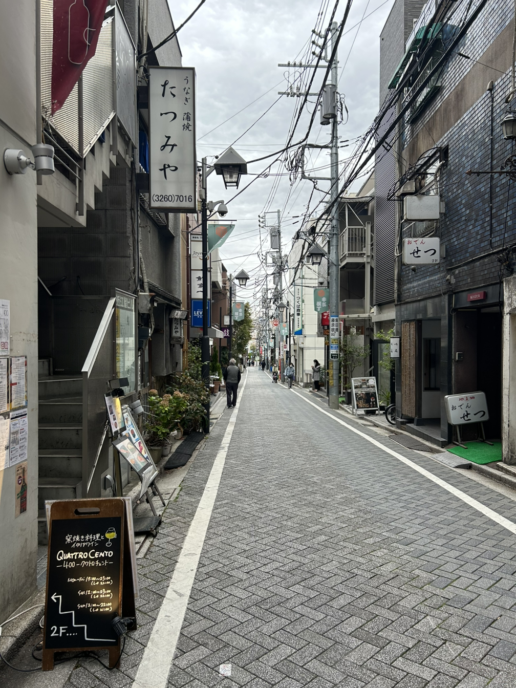 카구라자카가 리틀 파리라고 불린다는 소리를 들어본 적 있다. 프랑스어 학교와 프렌치 레스토랑이 많아서 그렇다고. 리틀 파리라 불리는 곳이지만 과거 게이샤들이 많이 활동했던 곳이기도 해서, 에도 시대 느낌과 파리 느낌을 겸비한 묘한 분위기를 자아내는 장소다. 요즘에는 게이샤들이 있는 요정이 많이 없어지기도 했고, 워낙에 폐쇄적인 분야라 나는 이 일대를 돌아다니며 게이샤나 마이코는 한 번도 못 봤지만. 그래도 납작한 돌이 깔린 길이라든지 생활감이 묻어나는 채소가게, 당고며 전병 같은 군것질 거리를 파는 곳, 파인 다이닝 레스토랑들이 뭉쳐서 자아내는 분위기가 번잡한 시부야나 긴자 같은 곳과 사뭇 달라 좋았다. 여행하면서 길거리에서 느껴지는 정취나 향수, 낭만을 동경하는 나는 하라주쿠처럼 인파가 넘쳐나는 곳에서는 이리저리 휩쓸리느라 정신을 못 차리는데 이곳은, 특히 평일의 카구라자카는 예쁘고 조용한 인상이었다. 나는 가쿠라자카 역에 내려서 아카기 신사를 구경하고 이다바시 역 쪽으로 걸었다. 약간 흐린 하늘조차도 이곳의 낭만적인 분위기에 일조하는 것 같았다.