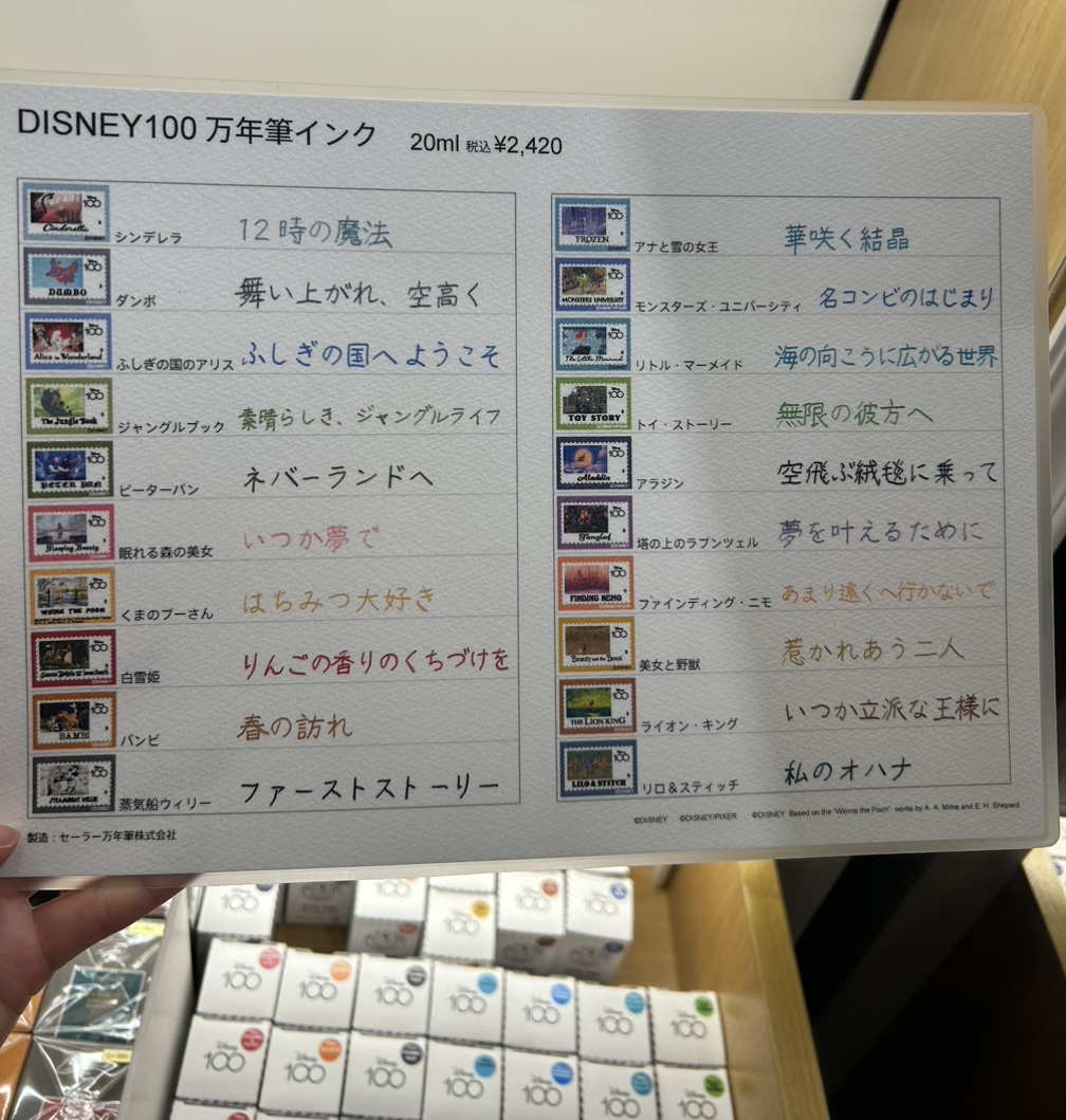 나는 만년필도 좋아해서 가성비 좋은 라미 제품을 몇 개 사서 쓰고 있는데, 이 곳의 만년필 잉크 종류 구경하는 재미도 쏠쏠했다. 특히 디즈니 100주년 기념 잉크들이 있었는데 잉크 이름도 디즈니 작품 이름이었고(어울리는 색깔과 작품을 절묘하게 매칭했다), 색감 테스트 문구도 각 작품을 연상케 하는 문구들로 쓰여있어 이런 섬세한 연출에 오타쿠는 또 감동했다. 잉크 이름 '신데렐라'는 푸른 먹색으로 '12시의 마법‘, ‘잠자는 숲 속의 미녀’는 밝은 분홍색으로 ‘언젠가 꿈속에서’. 이 얼마나 낭만적인지! 다만 가격이 20ml에 2,420엔으로 비쌌다. 라미의 잉크 카트리지도 있었는데 종류가 너무 한정적인 데다, 후다닥 쿠팡 가격과 비교해 봤는데 더 비싸서 구매하지는 않았다. 이토야의 제품들은 귀엽지만 가격은 귀엽지 않은 듯…