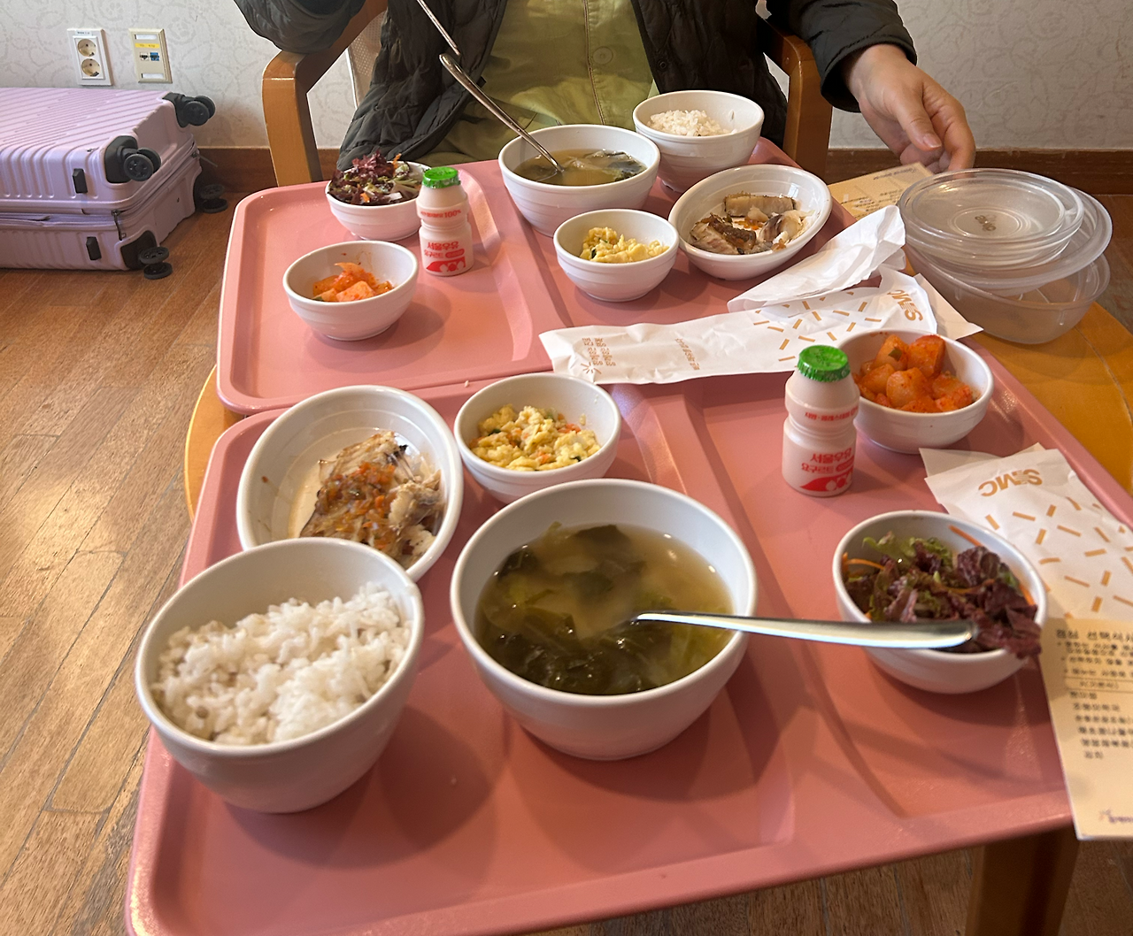 입원실은 환자와 환자 상주 보호자 1명만 드나드는 것이 원칙. 엘리베이터에서 내리면 원무처에서 받은 환자용, 보호자용 손목 밴드의 qr을 태그 해야 안으로 들어갈 수 있다. 도착을 알리고 병실을 안내받았고, 우리는 좀 일찍 와서 그런지 침대를 고를 수 있었다. (그래서 입원을 한다면 조금 일찍 오는 게 좋을 것 같다. 원하는 자리를 선택할 수 있는 가능성이 높아진다) 우리는 답답하지 않을 것 같은 창가 침대로 골랐다. 각오는 했지만 보호자용 침대는 정말 작더라.. 나는 키가 166센티지만 체구가 그리 큰 편은 아닌데도 좁다고 느꼈다. 대충 짐을 늘어놓고 병원의 구내식당에서 밥을 먹었다. 상주 보호자는 1인밖에 안 되기에 아빠는 병원 근처의 호텔로 갔고 나랑 엄마는 병실로 복귀했다.