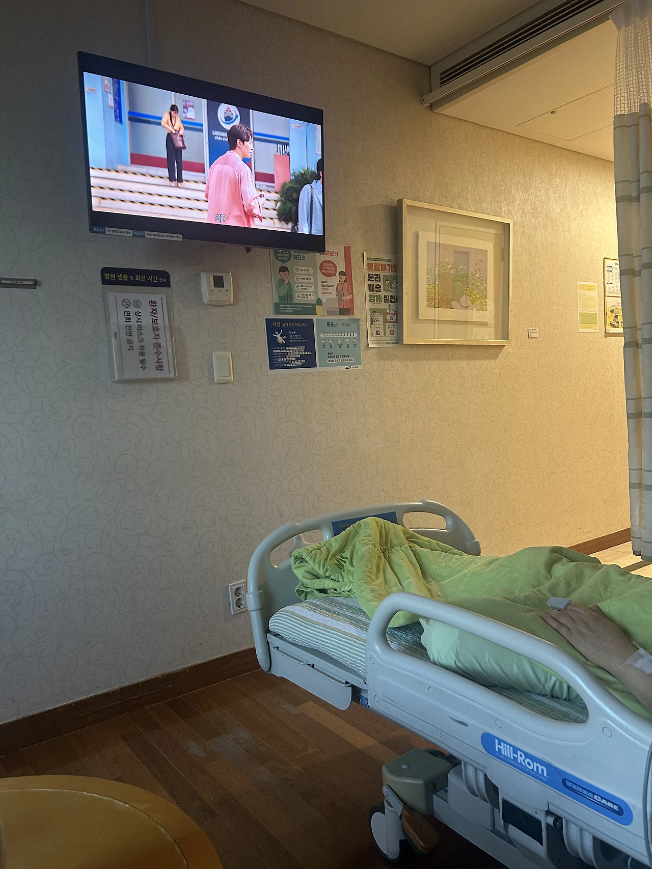 무리하면 안 되기에 주로 병실에서 시간을 보냈다. 다행히 tv에 넷플릭스 연결이 되어서, 내 넷플릭스로 김 부장 시리즈와 태풍상사, 슬기로운 감방생활을 같이 봤다. 환자 점검하러 오신 간호사 선생님이 병실 TV에 넷플릭스가 연결되냐고 놀라셔서 머쓱.. 어떻게든 재밌게 지내기 위해 노력한 결과랄까.. 환자에게는 잘 회복되고 있다는 긍정적인 생각이 중요할 듯 해, 재밌는 거 보고 조금씩 산책하고 병원이 시키는 대로 잘 따랐다.