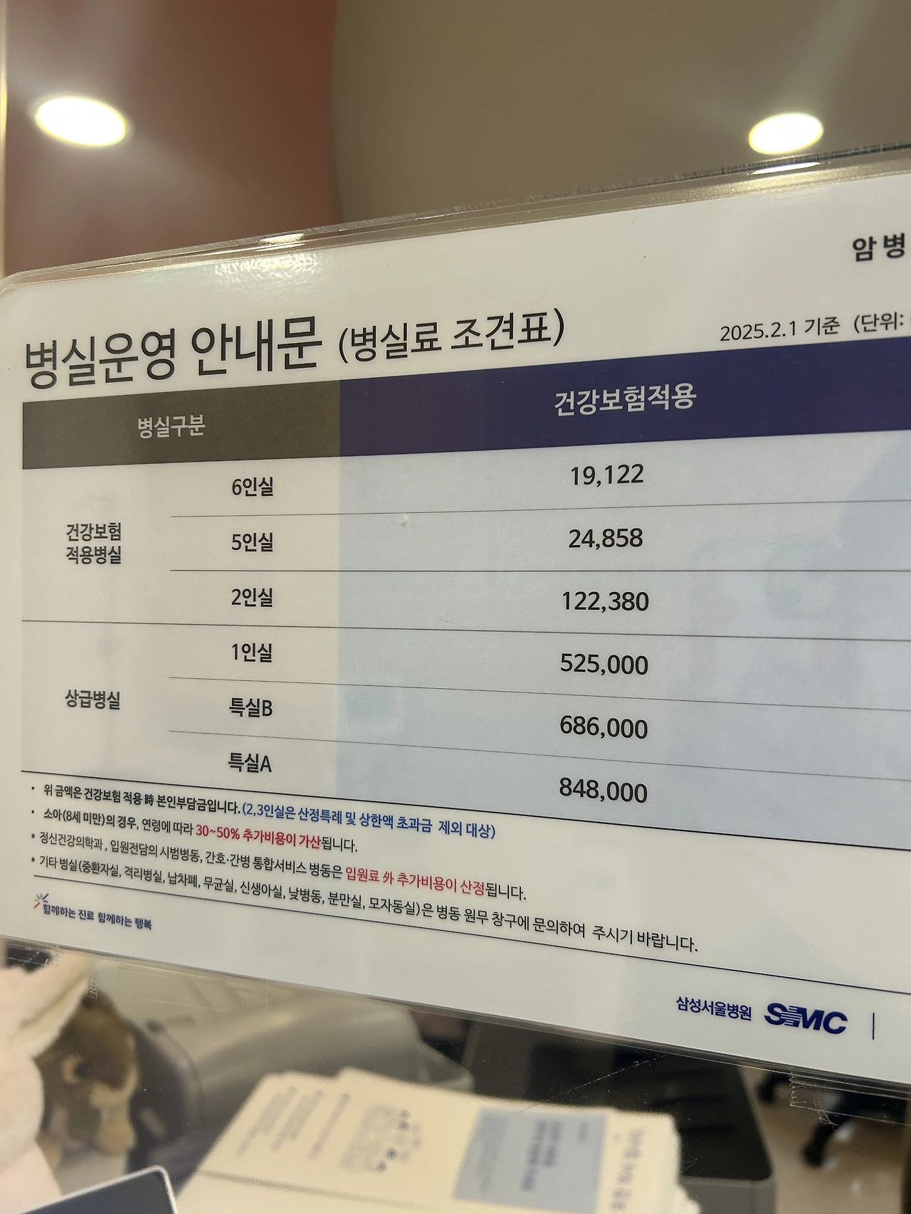 6층으로 돌아와 짐을 옮기기 시작했다. 우리는 특실 b로 배정받았는데 문 열고 들어가 보니 전망도 좋고 너무나도 쾌적했다. 일단 환자 침대도 조금 더 컸고, 보호자가 누울 수 있는 소파도 6인실의 보호자 침대보다 컸다. tv와 테이블도 있었고, 세면제품과 물병, 티슈가 들어가 있는 어메니티도 받았다. 수건도 하루에 2개 주고 하루 한 번 직원분이 청소도 해주신다. 비용이 너무 비싸긴 하지만, 엄마가 들어놓은 보험 덕에 커버가 될 듯했다. 약간 다른 이야기지만, 정말이지 이번에 엄마가 암보험을 제대로 들어놓지 않았자면 이렇게 수술을 받기도 힘들었을 거다. 엄마는 로봇 수술을 받으셨는데 로봇 수술 특약도 해두어서 비용 보전이 되었고, 진단비 등을 다 받을 수 있게 해 놔서 특실 비용도 부담이 덜했다.