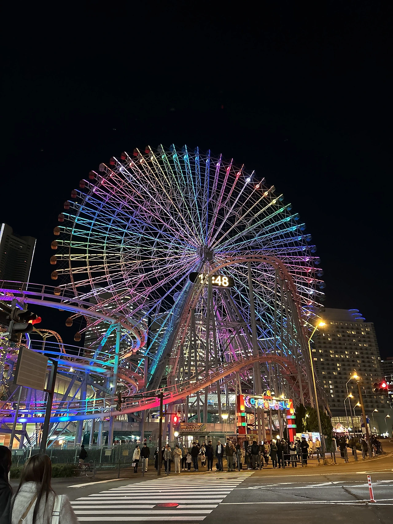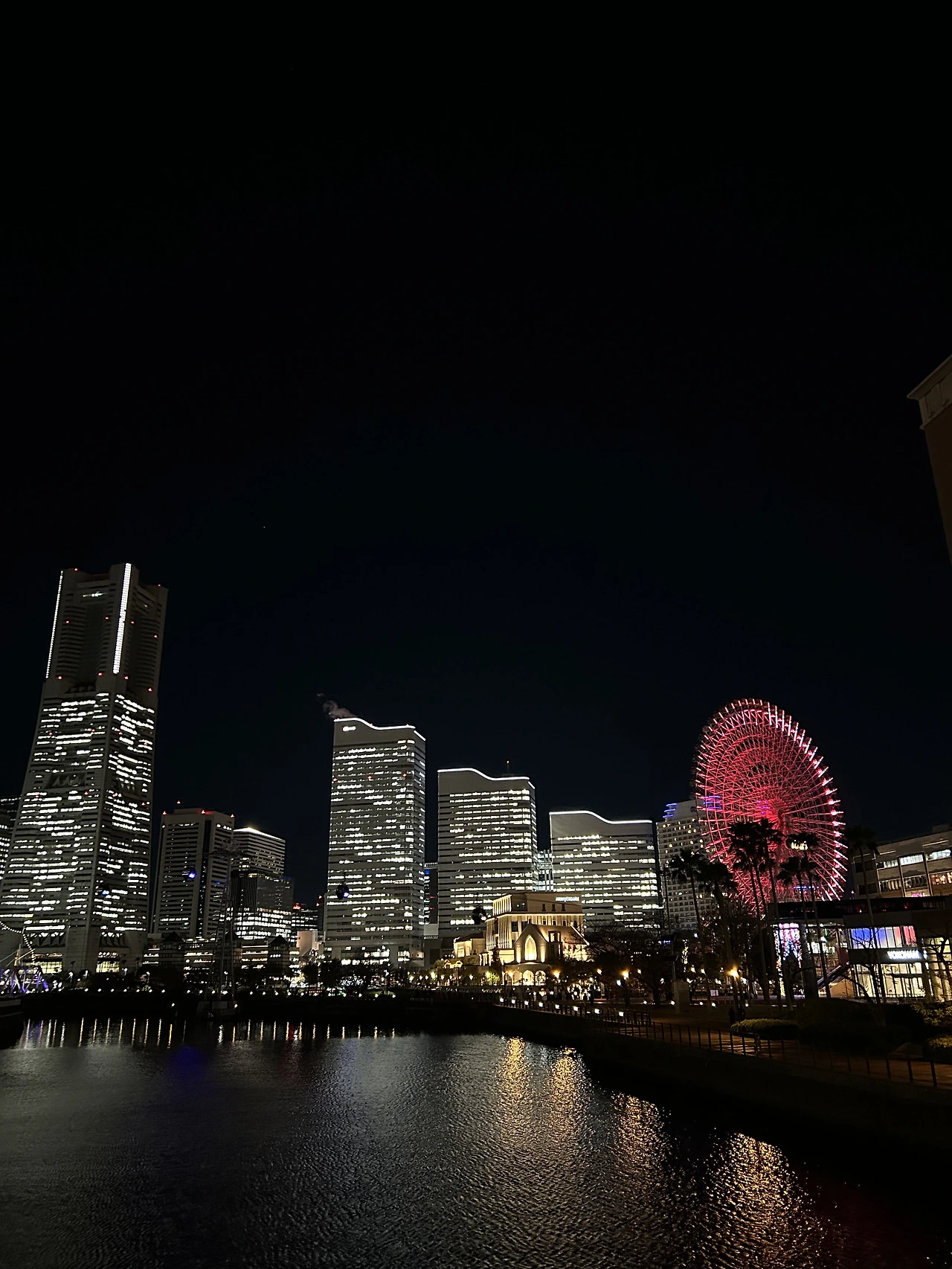 요코하마 코스모 월드의 대관람차가 이곳 야경을 제대로 휘어잡고 있다. 압도적인 크기의 대관람차는 시시각각으로 빨갛다가 파랗다가 무지개색을 뿜다가.. 멀리서 바라보면 끝없이 보고 서있을 수 있을 것 같았다. 적당한 밸런스로 치솟는 고층 건물의 야근하는 불빛들도 아름답고.