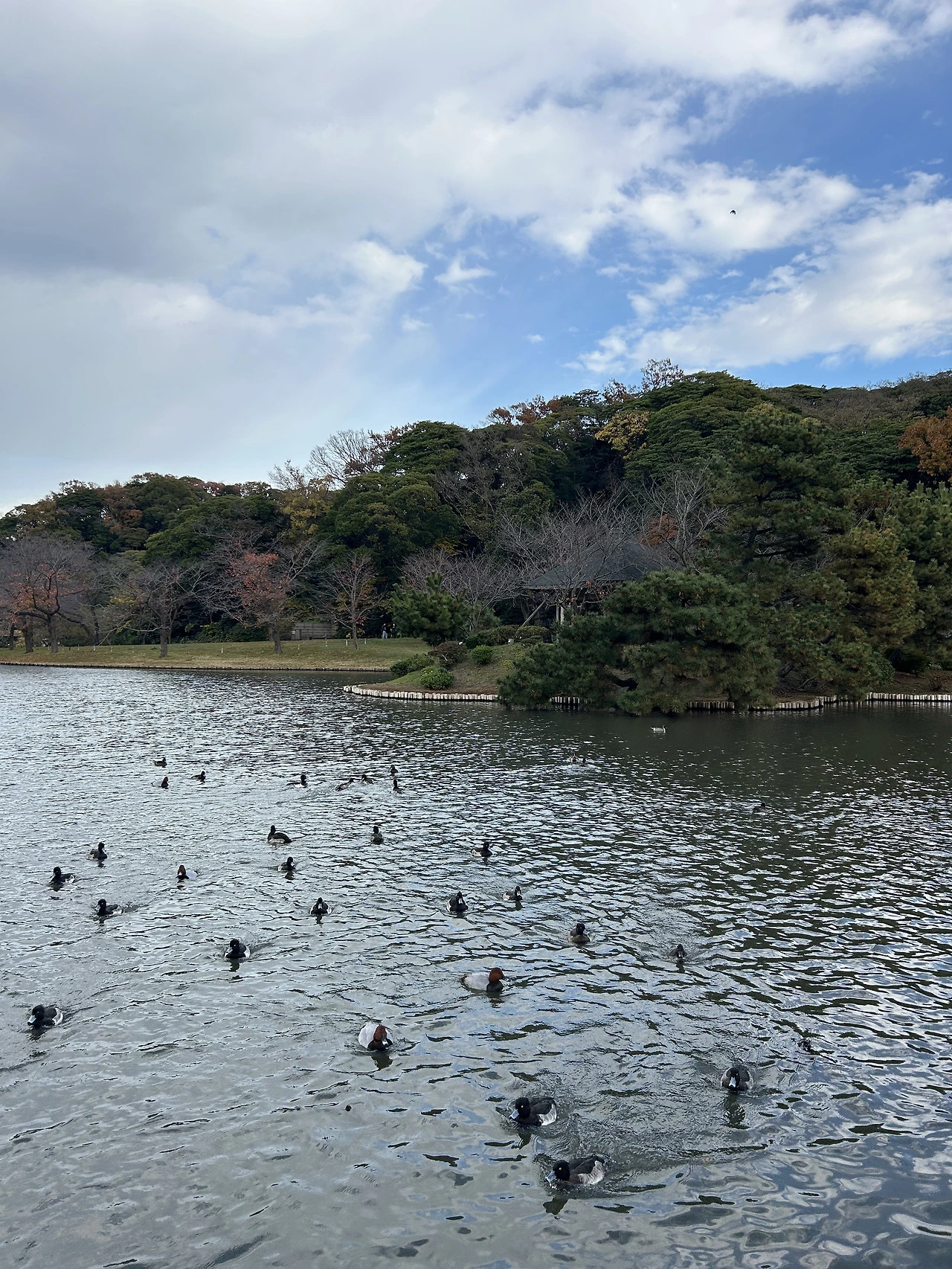 12월 초에 가니 단풍은 거의 져버렸지만, 바닥에 쌓인 알록달록한 잎사귀들이 주는 낭만이 있었다. 나무와 연못이 주는 차분함도 좋았고. 구경하며 걷다 보니 대연못에 도착했다. 그런데 여기 오리가 왜 이렇게 많아.. 몇십 마리는 되어 보이는 오리들이 호수 위를 유영하고 있었다. 근처에 보니 오리에게 줄 수 있는 빵가루도 팔고 있던데, 누군가 빵가루를 날려주니 우르르 몰려와 열심히 주워 먹는다. 오리를 이렇게 가까이서 구경해 보는 건 생각도 못해봤는데.