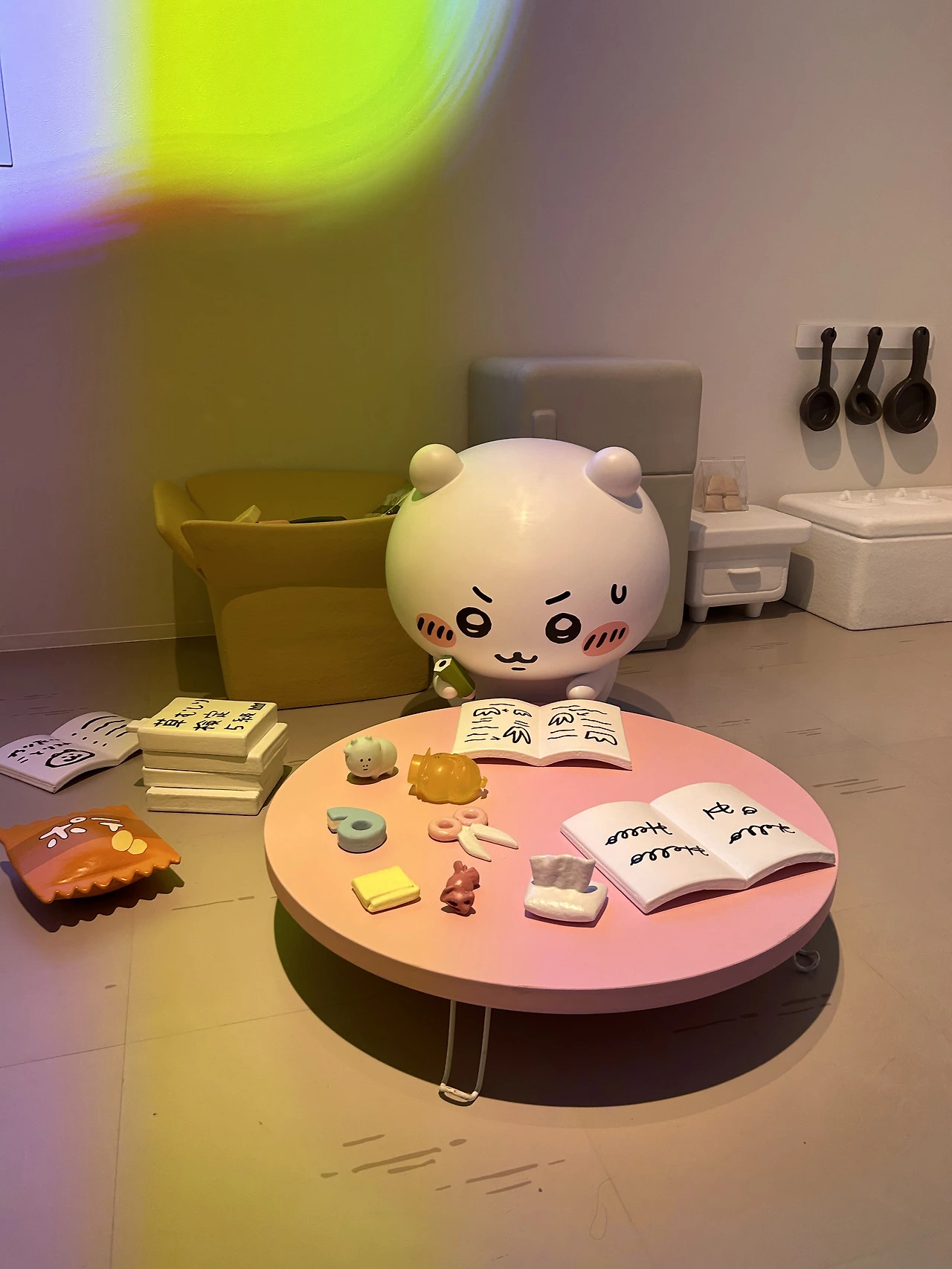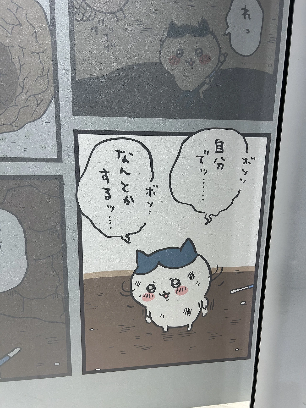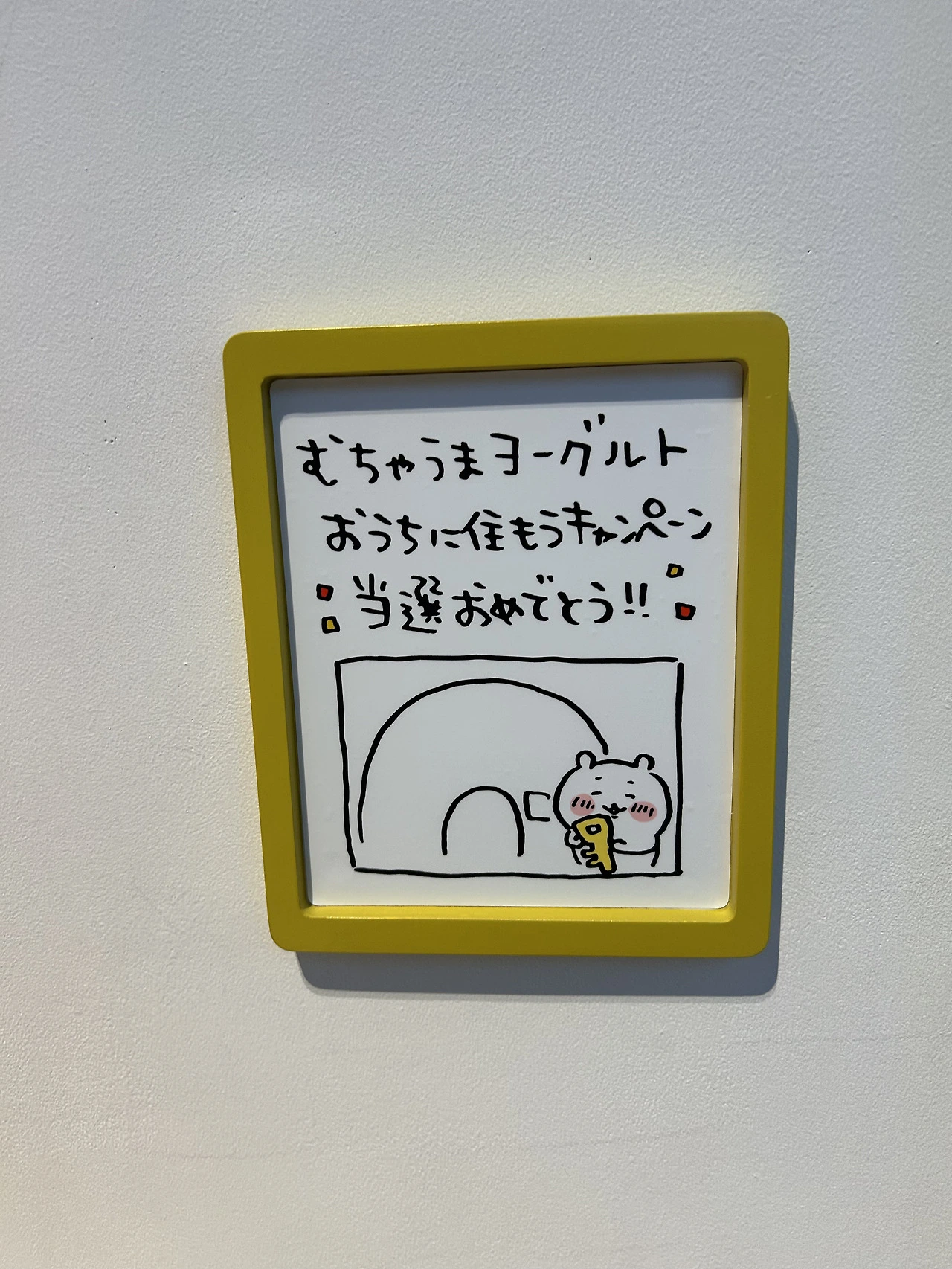 그리고 만화에서만 보던 치이카와의 집이 있다! 운이 좋게 요구르트 회사에서 진행하는 캠페인에 당첨되어 받은 치이카와의 집.. 우리로 치면 청약 당첨인 것일까, 그것도 무료로! 아무튼 집 앞에 야무지게 본인 얼굴을 달고, 안에서 열심히 제초자격증 공부를 하는 치이카와를 만날 수 있었다. 땀까지 삐질 흘리며 열심히 공부하는 치이카와.. 그리고 치이카와의 옷이라든지 토벌할 때 쓰는 장비라든지, 가방도 있었고. 캠페인 당첨 인증숏도 걸려있었다. 진짜 치이 집 들어오면 이렇게 생기지 않았을까 생각이 들 정도로 섬세하게 구현되어 있어 오타쿠는 감동했다.