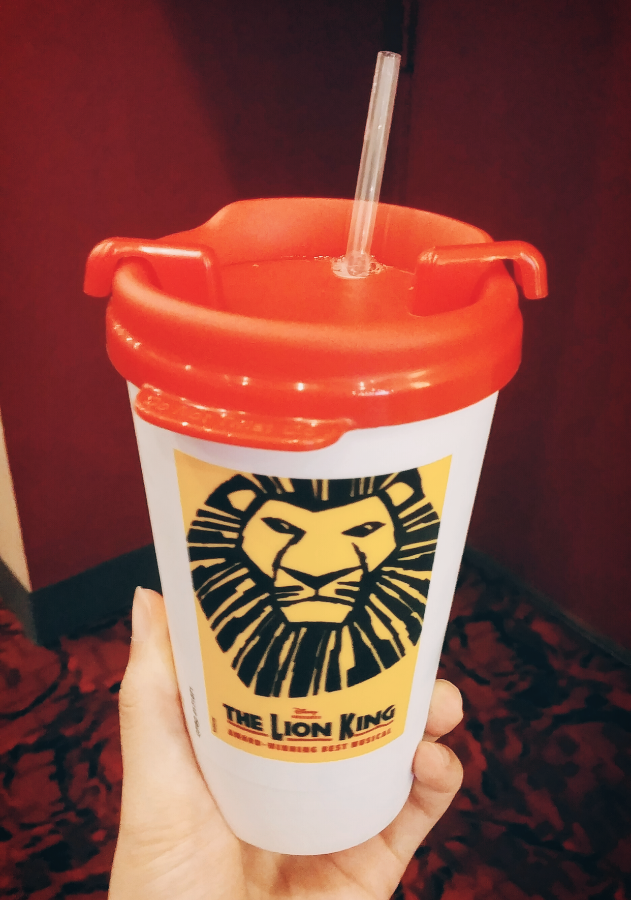 입장하면 라이온 킹 컵에 알코올음료를 넣어 파는 스낵바가 있다. 왠지 저 컵이 갖고 싶기도 하고, 어둑어둑해진 타임스퀘어에서 그토록 고대하던 라이온 킹을 볼 건데, 맨 정신으로 그냥 있자니 아쉬운 감이 들어 샹그리아 칵테일을 하나 주문했다. 플라스틱 컵에 뚜껑이 달려있어, 극장 내로 가지고 들어가도 OK!