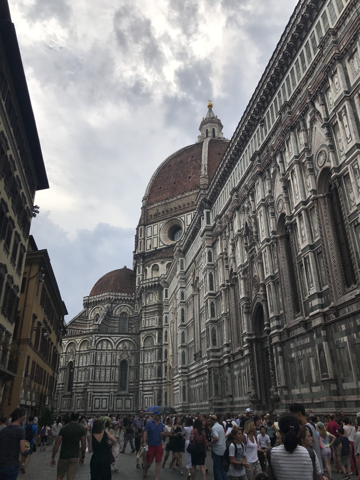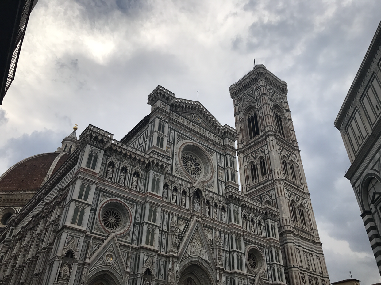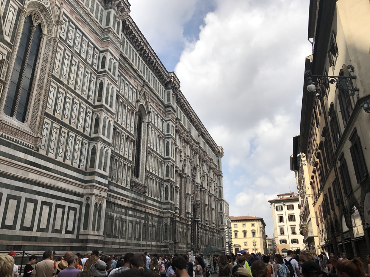 처음 보는 순간 그 규모와 분위기에 압도되었던 것 같다. 로마에서 이미 건축의 정수를 충분히 느꼈기에, 피렌체는 좀 심심하지 않을까 지레짐작했던 나 자신이 머쓱해지는 순간. 도착한 시점에는 하늘이 좀 흐렸었는데, 그 흐린 하늘을 낭만적으로 보이게 하는 매력이 있었다. 정해진 시간보다는 좀 여유 있게 도착해서 성당 앞쪽만 한번 가볍게 스윽 둘러보려고 했는데, 자꾸 바라보고 멈춰서 있게 되었다. 이러다간 두오모 쿠폴라 예약해놓은 입장 시간보다 늦을 것 같아 정신줄을 부여잡고 입장 줄을 찾아가는데, 사람이 워낙 많아서인지 몇 번 사람들에게 물어보고 나서야 제대로 된 줄을 찾을 수 있었다.